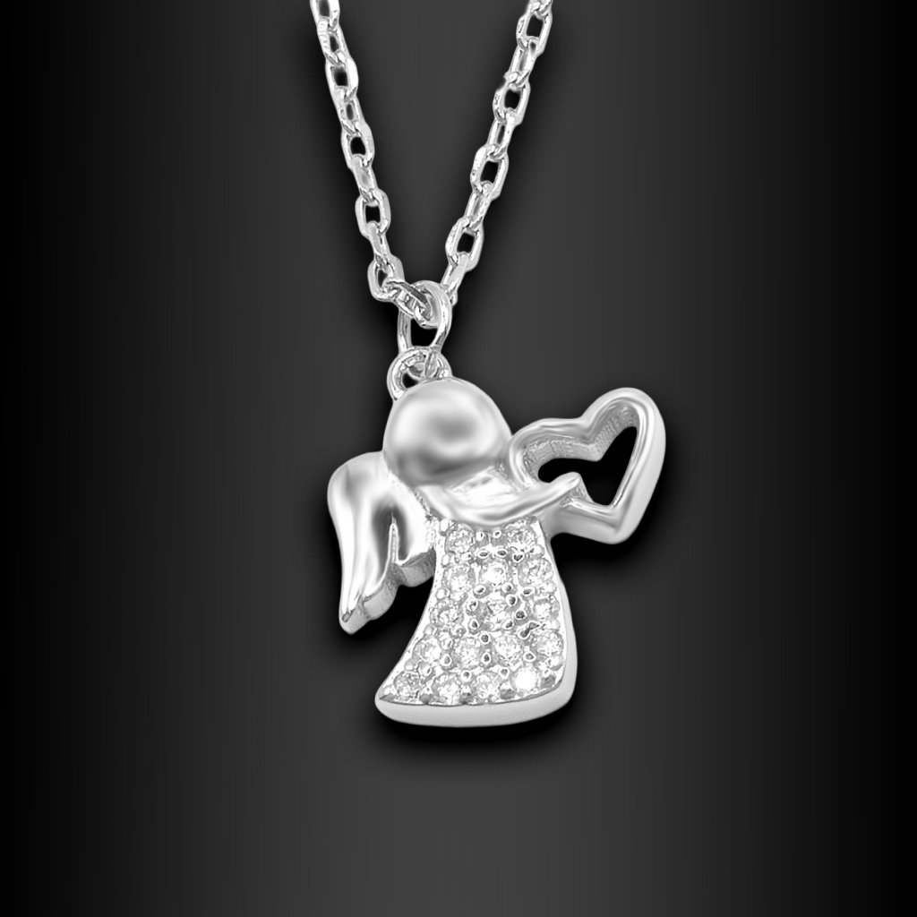 Elegantní stříbrný náhrdelník s andělíčkem zdobeným zirkony, držícím srdce.