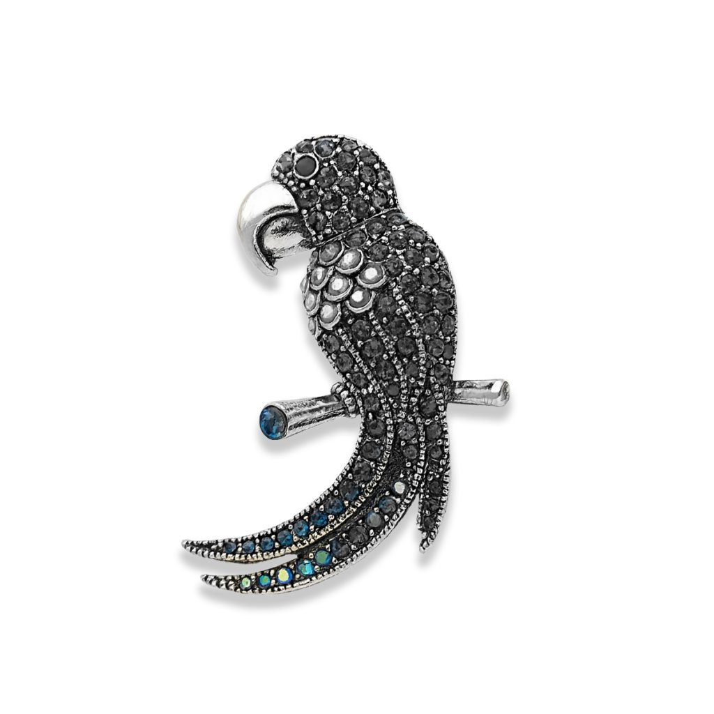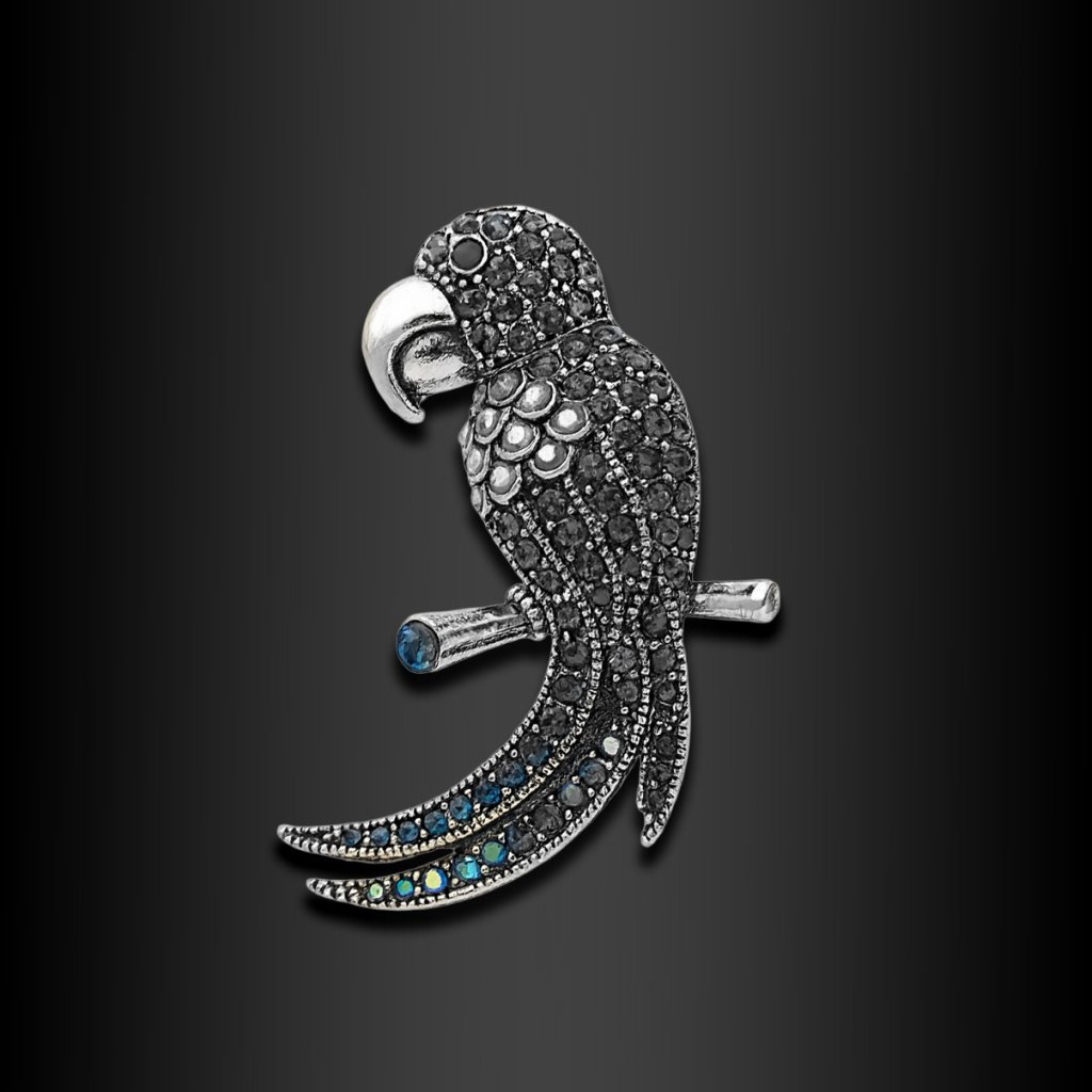 Elegantní brož ve tvaru papouška, zdobená černými krystaly s jemným kouřovým odleskem. Symbol tajemství, síly a vnitřní elegance 🖤 Exkluzivně na DG Šperky