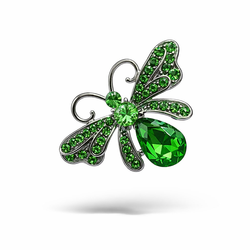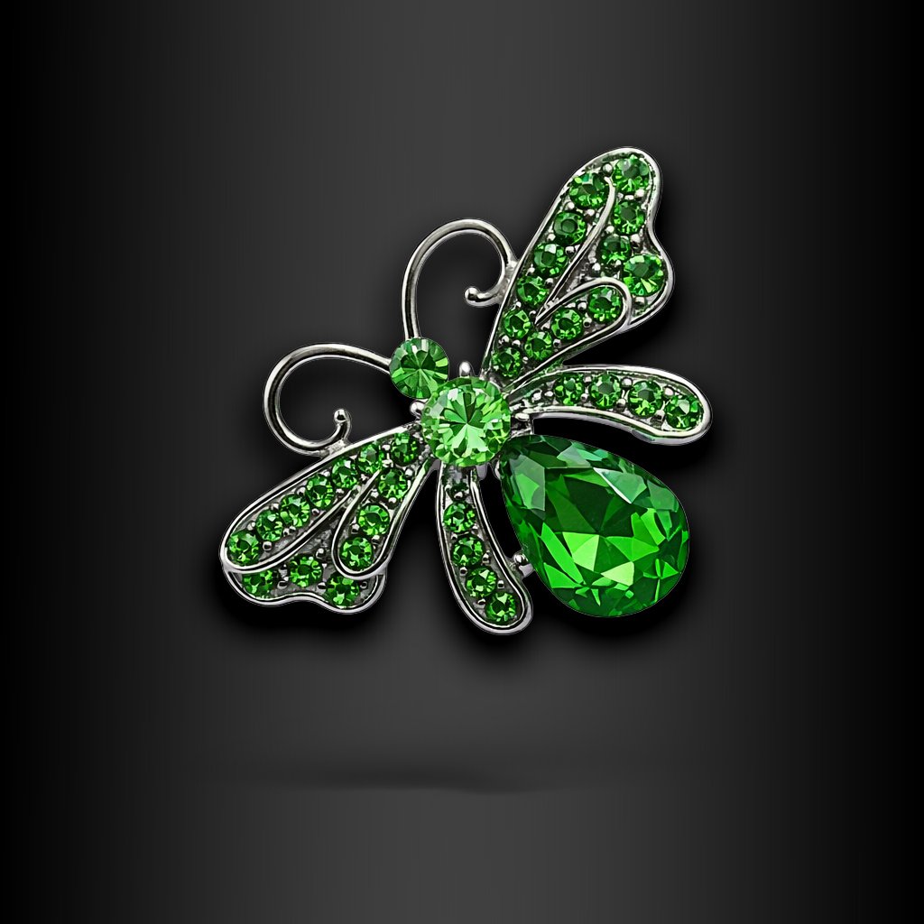 Dominantním prvkem je kapkovitý kámen, který dodává broži ženskost a jemný lesk. Křídla jsou bohatě osazena drobnými kamínky, jež zachytávají světlo při každém pohybu. Celek působí živě, jako by se brož každou chvíli chtěla vznést.