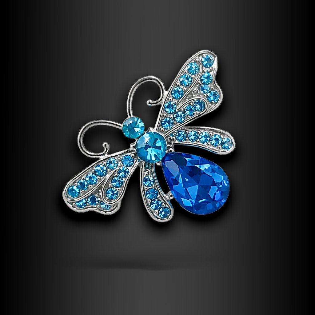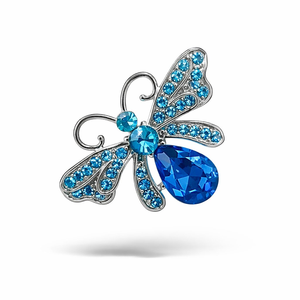 Dominantním prvkem je kapkovitý kámen, který dodává broži ženskost a jemný lesk. Křídla jsou bohatě osazena drobnými kamínky, jež zachytávají světlo při každém pohybu. Celek působí živě, jako by se brož každou chvíli chtěla vznést.