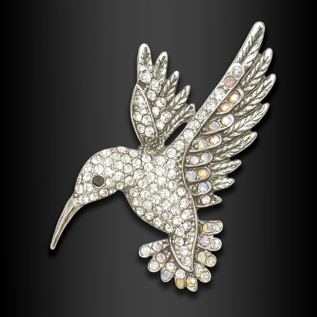 Brož Colibria Crystal působí jako ledová jiskra v pohybu. Tělo i křídla zdobí čiré krystaly, které v některých místech přecházejí do jemně duhového odlesku, vytvářejícího efekt zimního světla nebo křišťálové rosy. Stříbrný základ ještě více podtrhuje její vznešenost.
