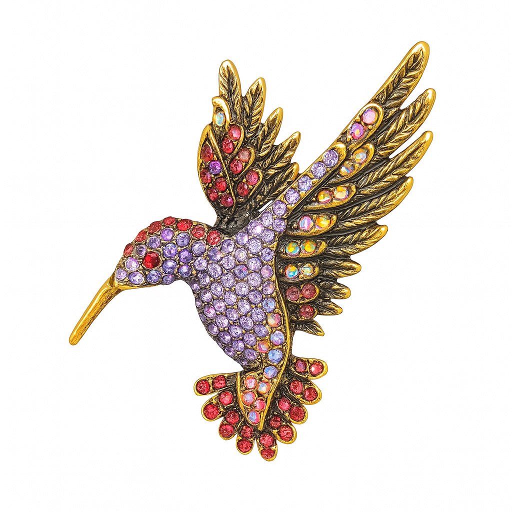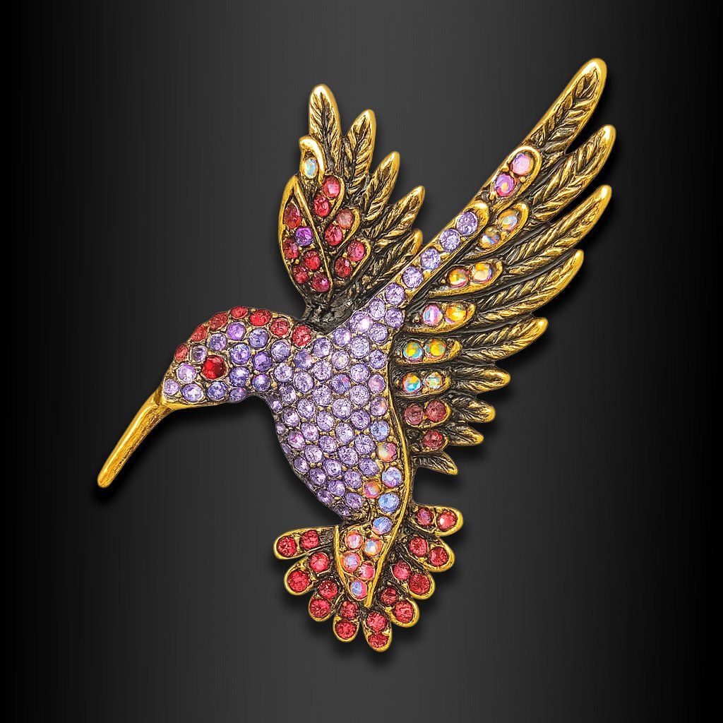 Elegantní brož v podobě kolibříka se zářivými krystaly v odstínech lila, červené a duhově zlaté. Jemná, éterická a okouzlující 🖤 Exkluzivně na DG Šperky