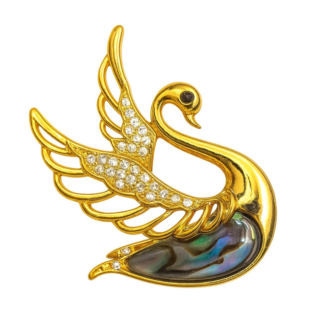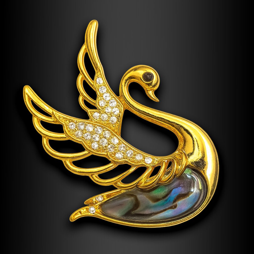 Zářivě zlatá brož ve tvaru ladné labutě s přírodní perletí a třpytivými krystaly – královský doplněk pro výjimečné ženy 🖤 Exkluzivně na DG Šperky