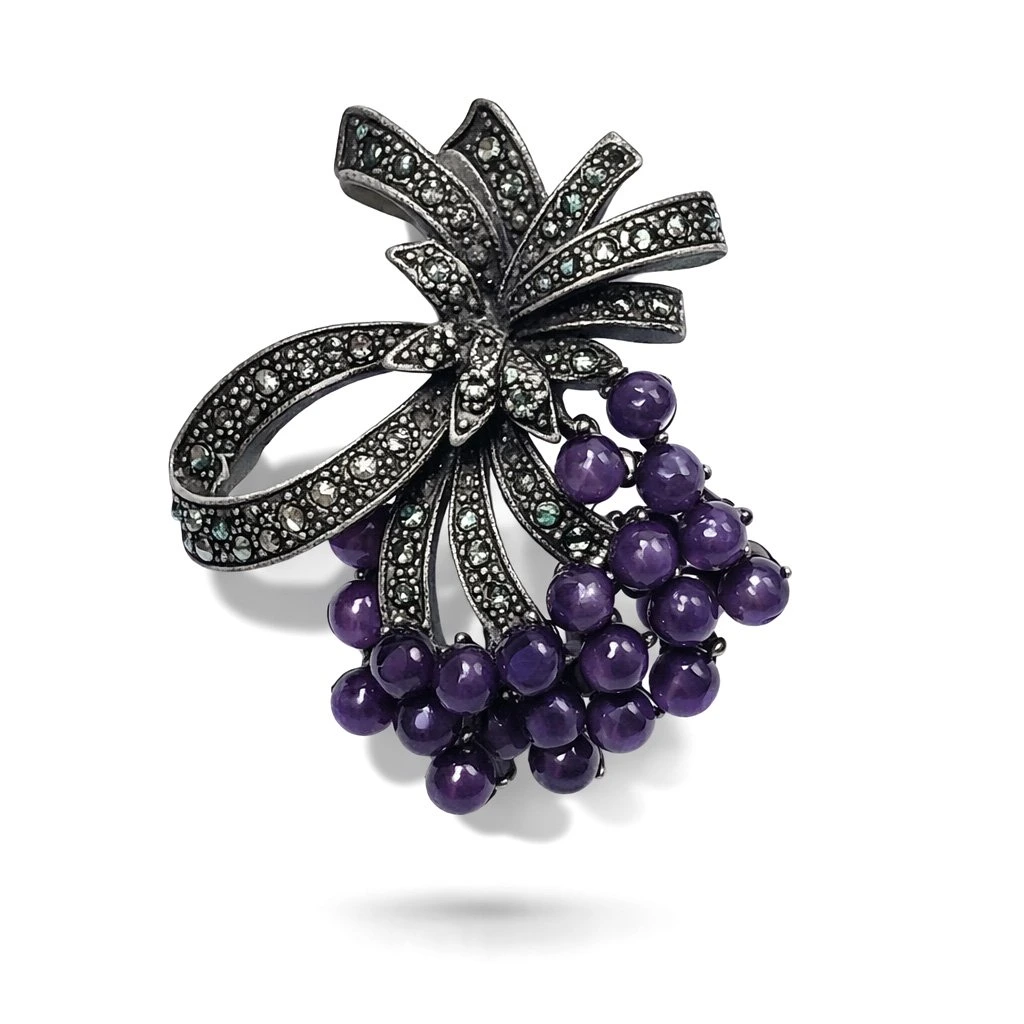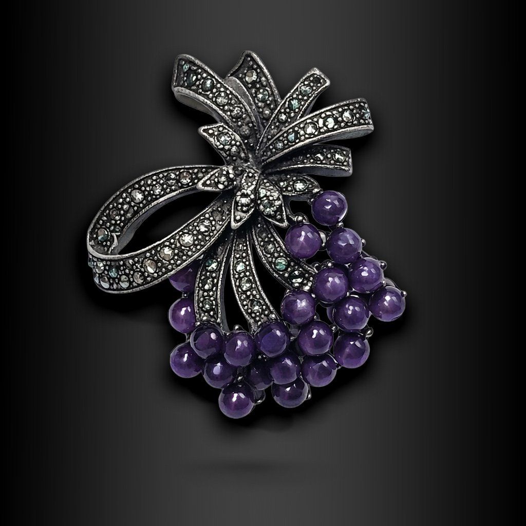 Horní část tvoří elegantní mašle zhotovená v antickém stříbrném kovu, jejíž každý centimetr povrchu pokrývají drobné marcasitové krystaly s tlumeným, diskrétním třpytem. Nejde o křiklavý lesk — je to ten kultivovaný, hlubší záblesk, jaký známe z pravého stříbra nebo vitrín starožitnictví. Každý oblouček mašle je precizně modelovaný, přechody jsou čisté a plastické - kov vypadá jako odlitý zlatníkem, ne vylisovaný strojem.