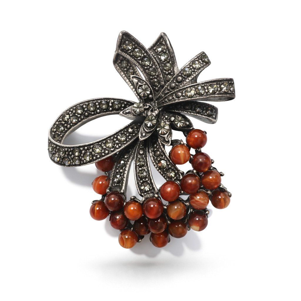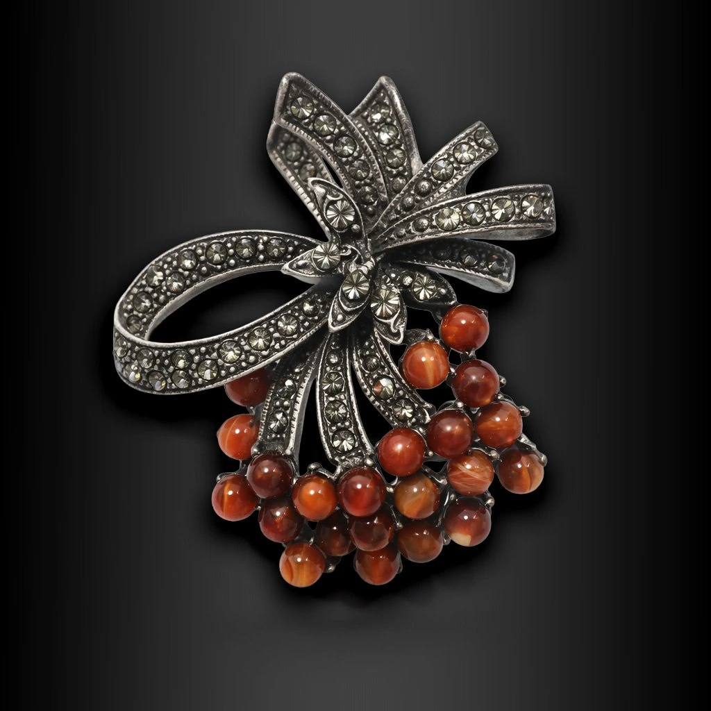 Brož Dorethia - antická mašle s marcasity a střapcem přírodních korálků, která vrací eleganci zlaté éry