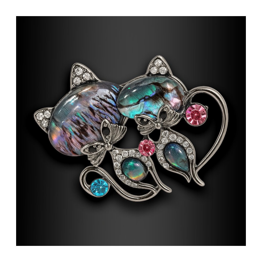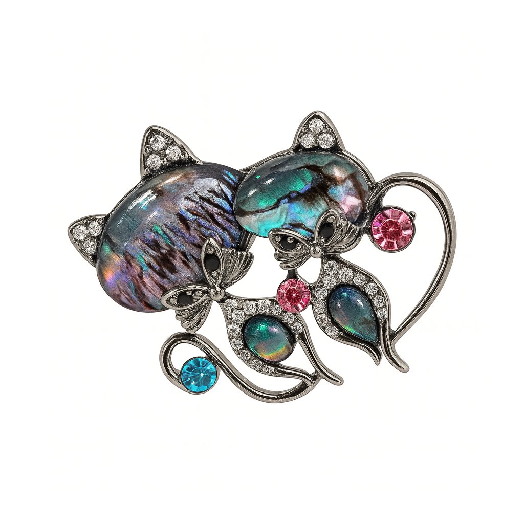 Tato půvabná brož Felinetta Silver zachycuje dvě stylizované kočky zdobené duhovou perletí, třpytivými kamínky a hravě barevnými krystaly. Kombinace romantiky, hravosti a elegance z ní činí výjimečný doplněk pro každou příležitost — ať už ji připnete na kabát, halenku, kabelku nebo použijete jako ozdobnou vlasovou sponu.