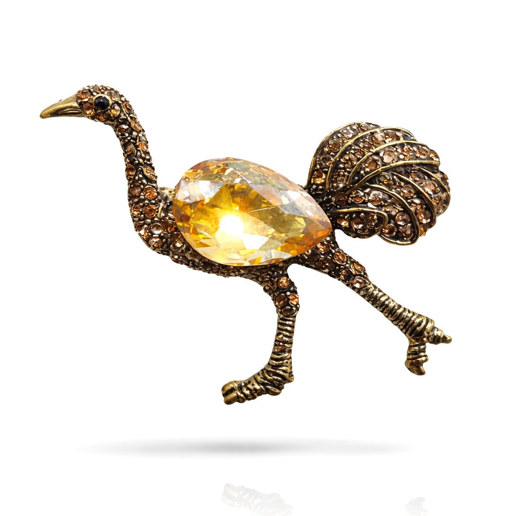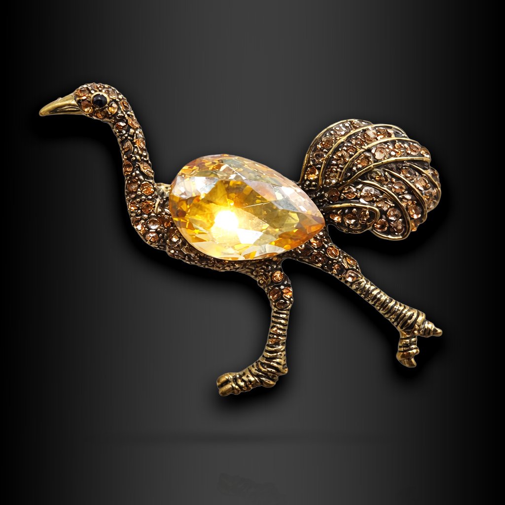 Brož Lustrea je šperk, který okamžitě přitáhne pozornost. Její design vychází z elegantního motivu exotického ptáka, jehož silueta působí jemně a zároveň velmi dekorativně. Tělo ptáka zdobí velký broušený kámen, který při dopadu světla vytváří intenzivní třpyt a stává se dominantním prvkem celé kompozice.