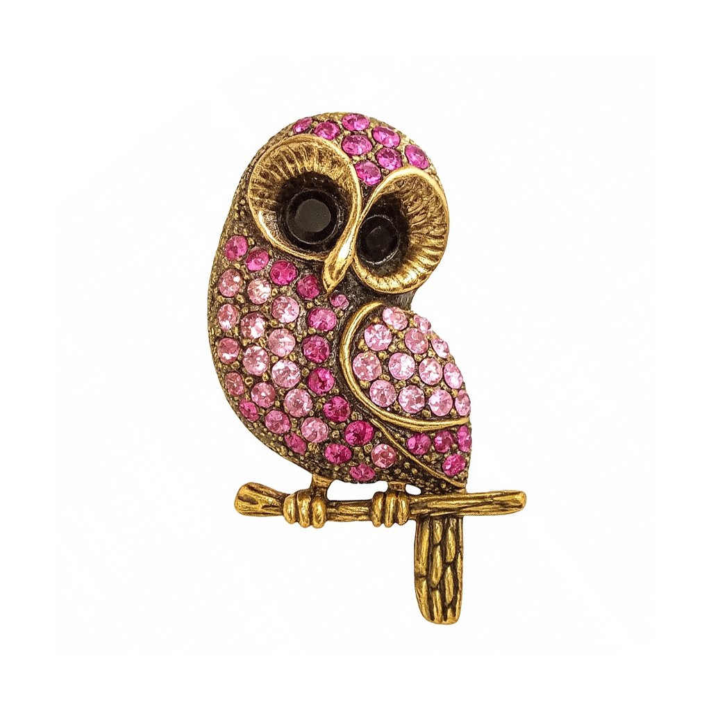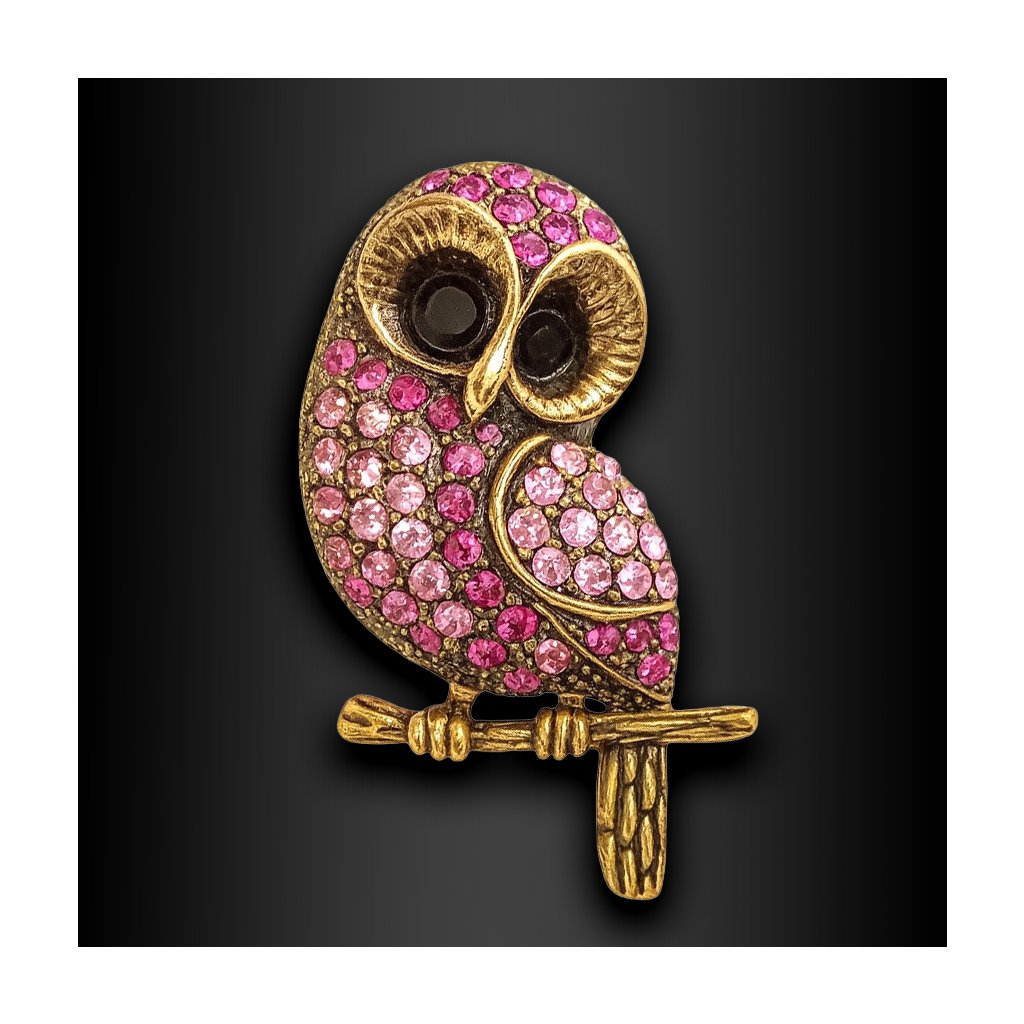 Půvabná brož ve tvaru sovy s růžovými krystaly v antickém zlatém provedení. Záhadná, roztomilá a plná symboliky 🖤 Exkluzivně na DG Šperky