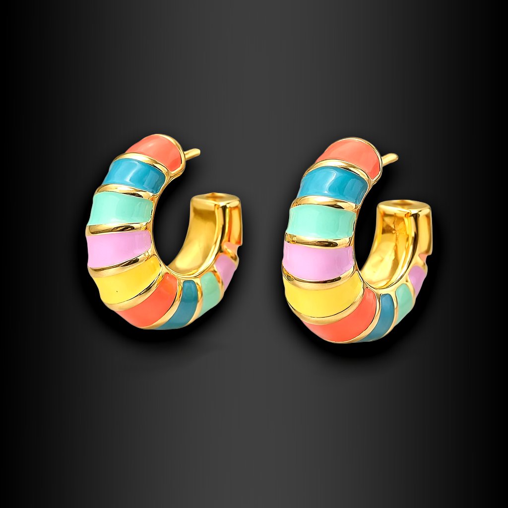 Barevné segmenty jsou odděleny zlatými liniemi, díky čemuž působí náušnice luxusně a uhlazeně, nikoliv hravě či dětinsky. Povrch je hladký a lesklý, barvy naživo vyniknou ještě výrazněji než na fotografii.