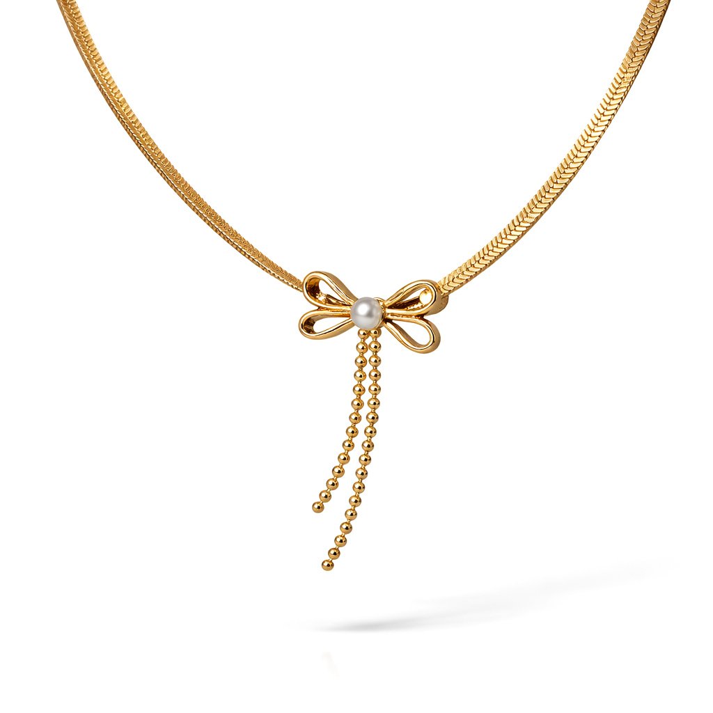 Mašle působí decentně, nikoli dívčím dojmem – její čisté linie a vyvážené proporce zajišťují moderní vzhled. Perlička dodává šperku klidný, luxusní detail, který zjemňuje celkový dojem a činí náhrdelník velmi univerzálním.