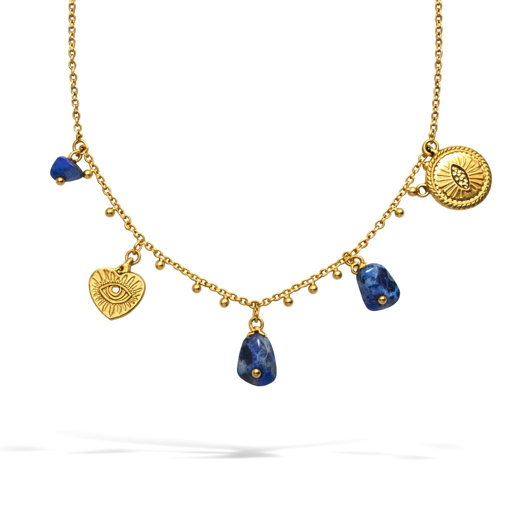 Coralyx je dámský ocelový náhrdelník, který v sobě spojuje ochrannou symboliku, přírodní energii a jemnou eleganci. Dominantním prvkem je motiv božího oka, symbol bdělosti, ochrany a vnitřní rovnováhy, doplněný přívěsky s přírodními kameny v hlubokých modrých odstínech.