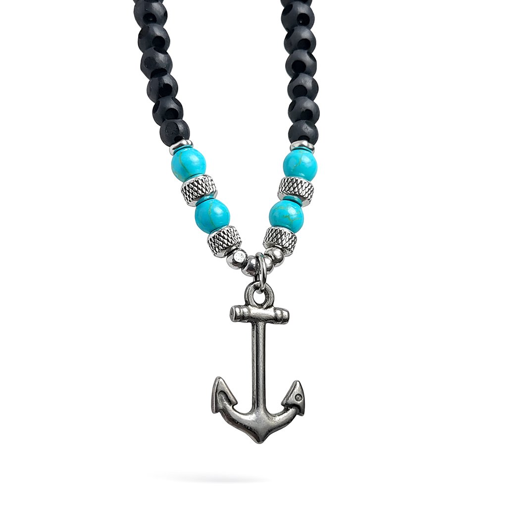 Korálkový řetěz v tmavém provedení doplňují tyrkysové akcenty, které náhrdelníku dodávají kontrast a lehký nádech svobody. Celek působí mužně, přirozeně a zároveň osobitě.