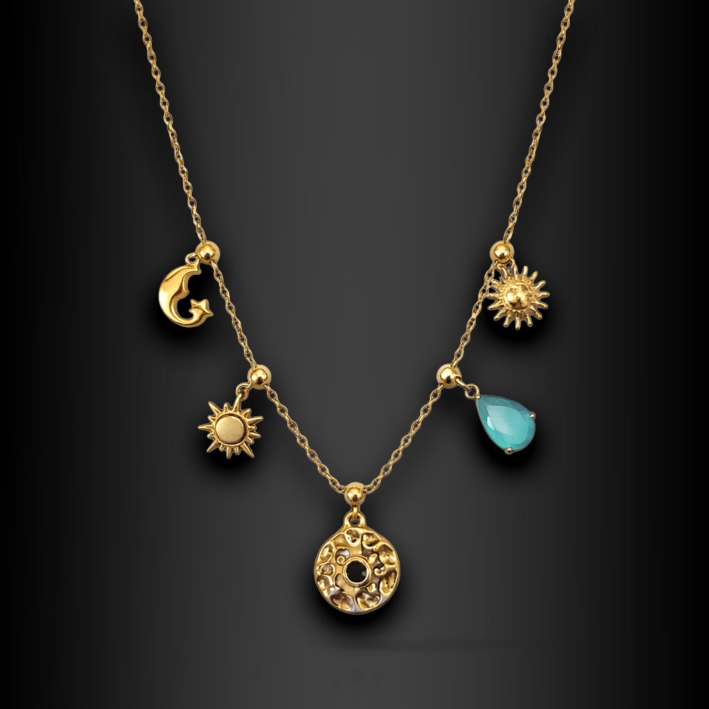 Elvera je dámský ocelový náhrdelník určený ženám, které vnímají šperk jako součást své identity. Jemný řetízek je doplněn několika drobnými přívěsky – každý s vlastním významem. Slunce, měsíc, kapka, strukturovaný kruh… dohromady tvoří harmonickou kompozici, která působí osobně a intuitivně.
