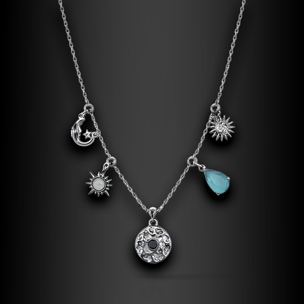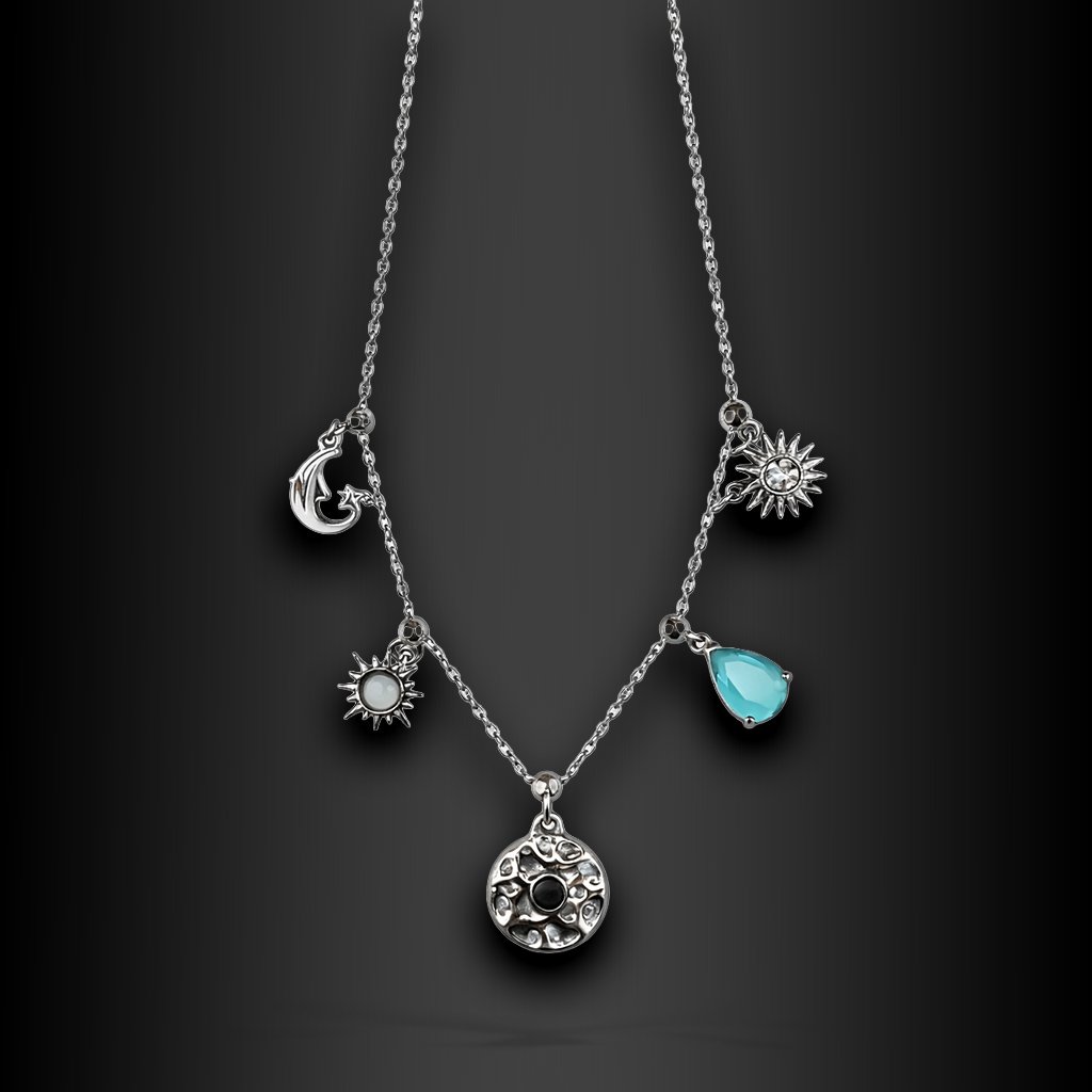 Elvera je dámský ocelový náhrdelník určený ženám, které vnímají šperk jako součást své identity. Jemný řetízek je doplněn několika drobnými přívěsky – každý s vlastním významem. Slunce, měsíc, kapka, strukturovaný kruh… dohromady tvoří harmonickou kompozici, která působí osobně a intuitivně.