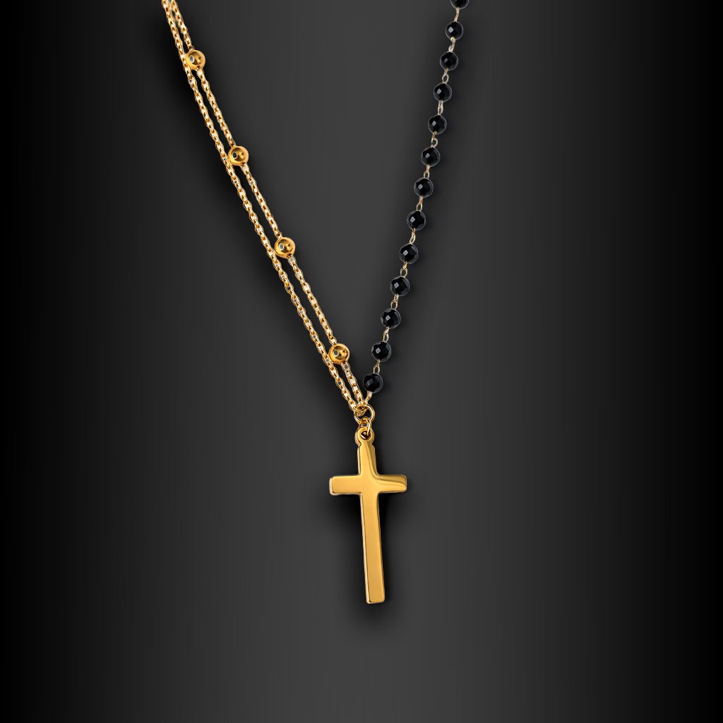 Křížek o velikosti přibližně 2,8 × 1,3 cm ± má dokonale hladký povrch bez zdobení. Právě tato čistota dává vyniknout jeho symbolice. Nepůsobí okázale, ale sebevědomě. Řetízek je doplněn černými zirkony v jemném řazení, které vytváří moderní, lehce dramatický efekt.