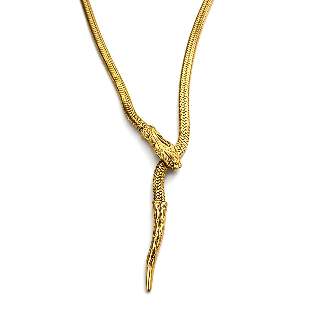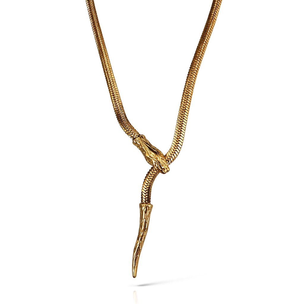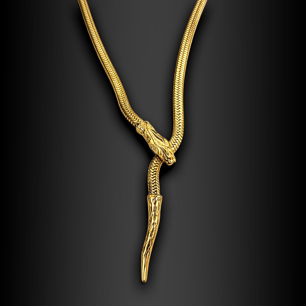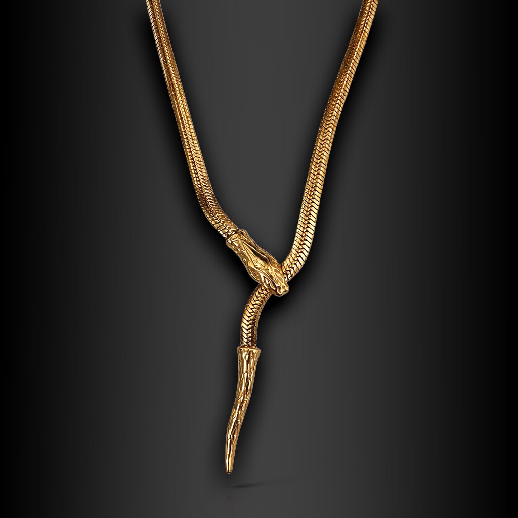 Dominantním prvkem je hadí hlava, kterou lze libovolně posouvat po těle náhrdelníku. Díky tomuto chytrému řešení je délka zcela univerzální – náhrdelník lze nosit vysoko ke krku, u klíčních kostí i hluboko do dekoltu podle outfitu a nálady. Bez klasického zapínání, bez omezení.