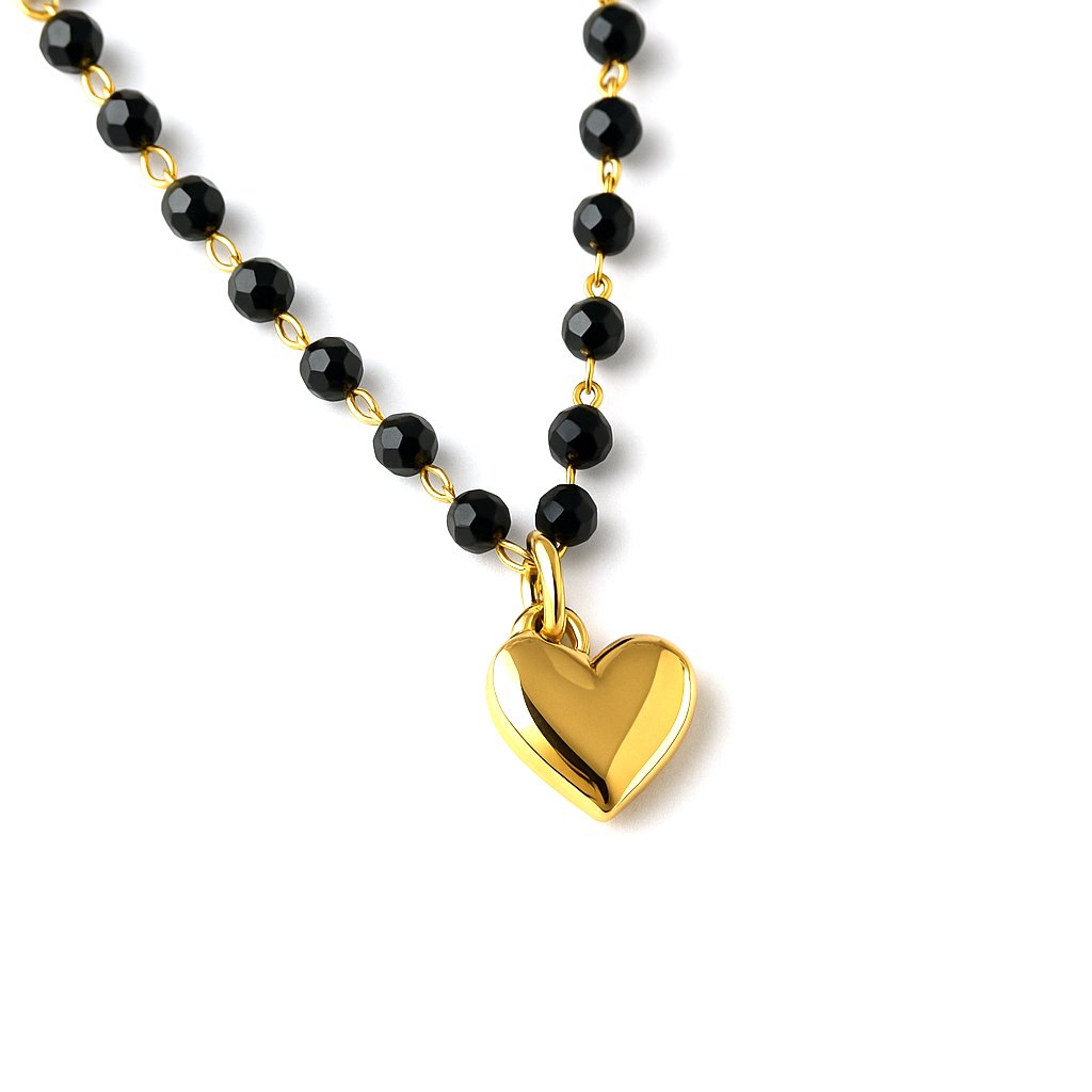 Qamira je náhrdelník, který spojí vaši něhu a sílu v jediném pohledu. Jemný řetízek tvořený onxově černými broušenými krystaly je jako noční obloha, do níž je zasazen zlatý symbol – minimalistické srdíčko, které bije jen pro vás. Díky zlaté chirurgické oceli je nejen krásný, ale i odolný. Ať už ho vezmete k večerním šatům nebo jen k halence – bude vždy tím šperkem, na který padne pohled jako první.