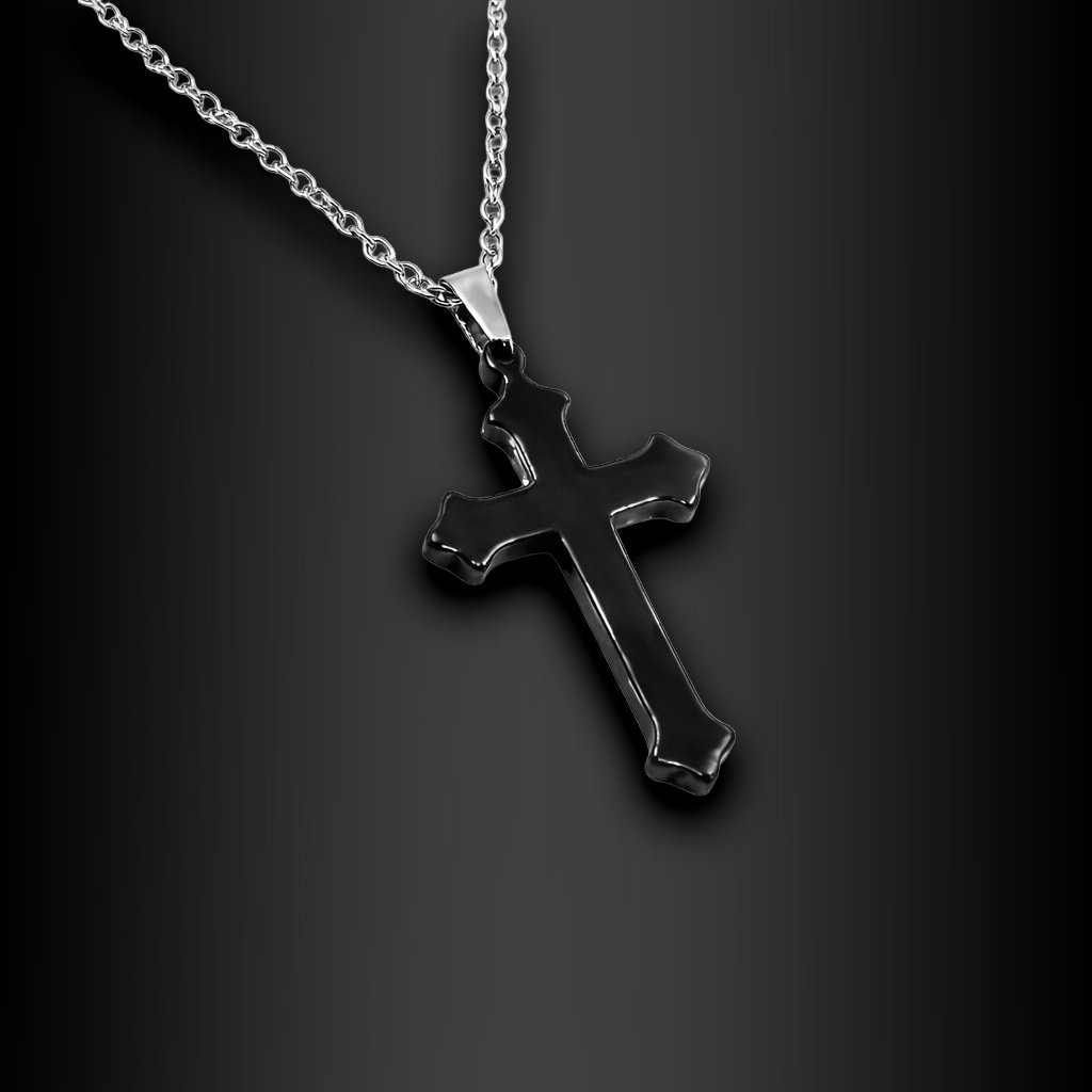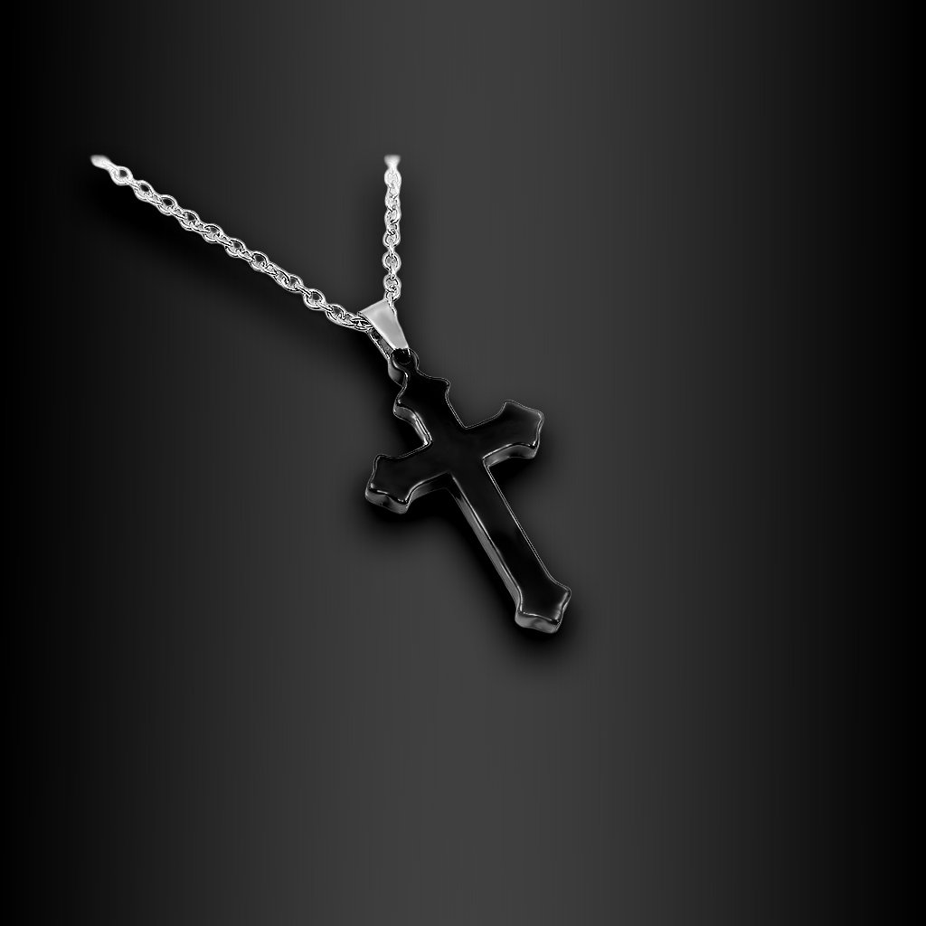 Keramika v černém lesklém provedení dodává křížku tvrdý, téměř surový vzhled, který skvěle kontrastuje s chirurgickou ocelí použité na očku i řetízku. Celek působí vyváženě, odolně a vizuálně silně, aniž by sklouzával k okázalosti.
