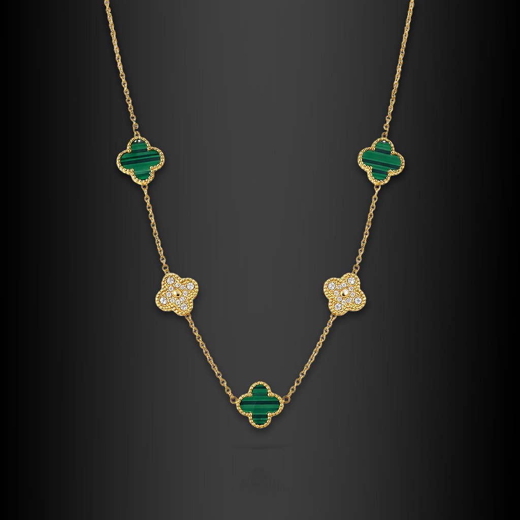 Elegantní náhrdelník Serena Verde z kvalitní oceli zdobí ikonické motivy čtyřlístku v kombinaci s hlubokým zeleným kamenem a jemnými zirkony. Zlaté provedení působí luxusně a nadčasově. Nastavitelná délka zajistí perfektní usazení v dekoltu. Šperk, který vyzařuje štěstí i ženskost 🖤 Exkluzivně na DG Šperky