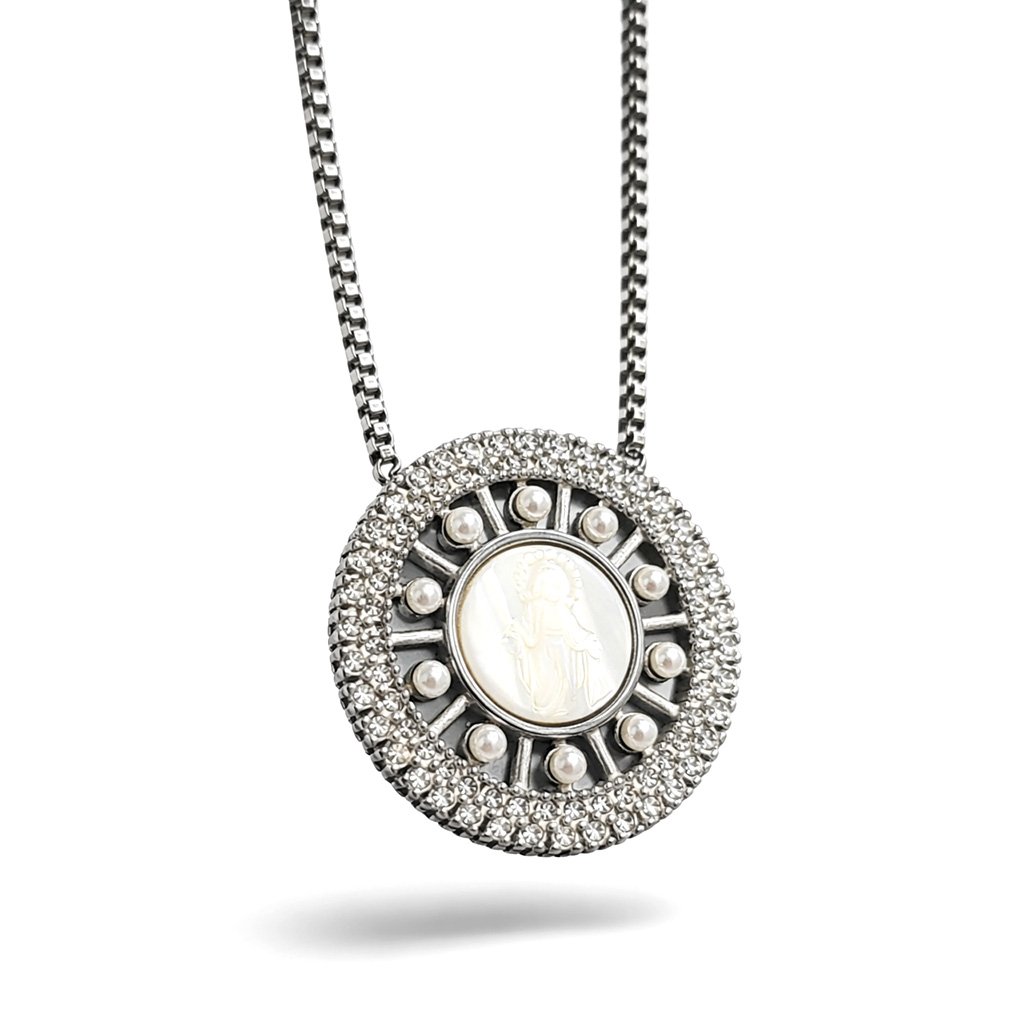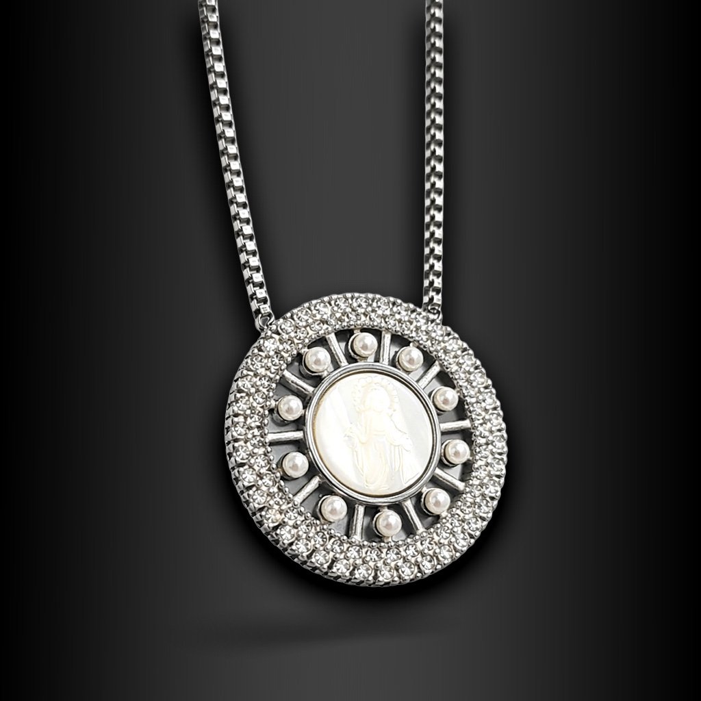 Výrazný dámský náhrdelník Valisse z chirurgické oceli kombinuje třpyt zirkonů, jemnost perliček a perletový střed se symbolem madonky. Bohatě zdobený kruhový přívěsek působí slavnostně, ženským a nadčasovým dojmem. Šperk, který okamžitě přitáhne pozornost a dodá outfitu hloubku i osobní význam 🖤 Exkluzivně na DG Šperky