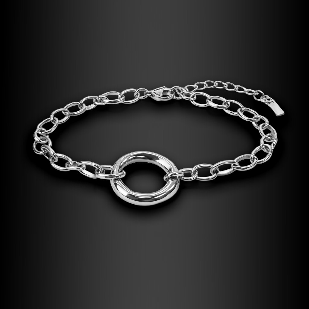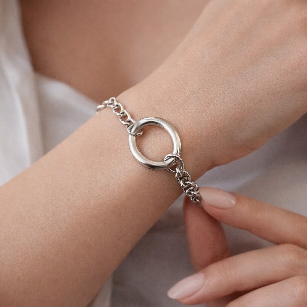 Arelia je dámský náramek postavený na jednoduchosti, která má sílu. Jemný řetízkový základ doplňuje dominantní kruhová ozdoba, jež přitahuje pozornost, aniž by působila rušivě. Právě tento detail dává náramku osobitý charakter a dělá z něj šperk, který funguje samostatně i v kombinaci s dalšími doplňky.
