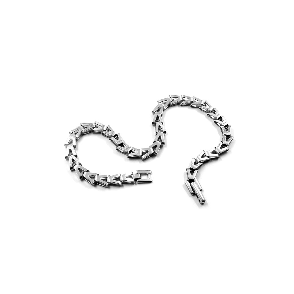 Tento dámský náramek z chirurgické oceli vás okouzlí svým geometrickým designem inspirovaným trojúhelníky či véčky, které se pravidelně propojují a vytvářejí moderní a nadčasovou linii. Šperk je velmi lehký a úzký, jeho šířka pouhých 0,5 cm zajišťuje, že se perfektně hodí pro ženy, které milují minimalistické doplňky, jež doladí jakýkoliv outfit bez zbytečné okázalosti.