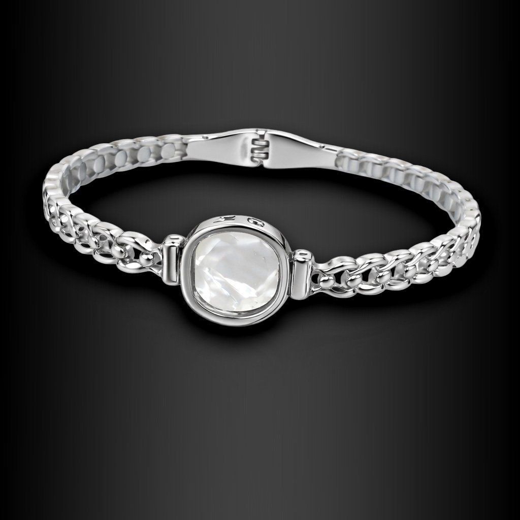 Středobodem náramku je centrální element o průměru přibližně 1,5 cm, zasazený v masivním bezelu z leštěné oceli. V jeho srdci se ukrývá inlay z perleti - materiálu, který lidstvo považuje za symbol luxusu, čistoty a ženské síly po tisíce let. Perleť v různých úhlech světla jemně mění svůj odstín, přechází z čisté bílé přes krémovou až k jemně duhovým odleskům. Žádný pohled na ni není úplně stejný.