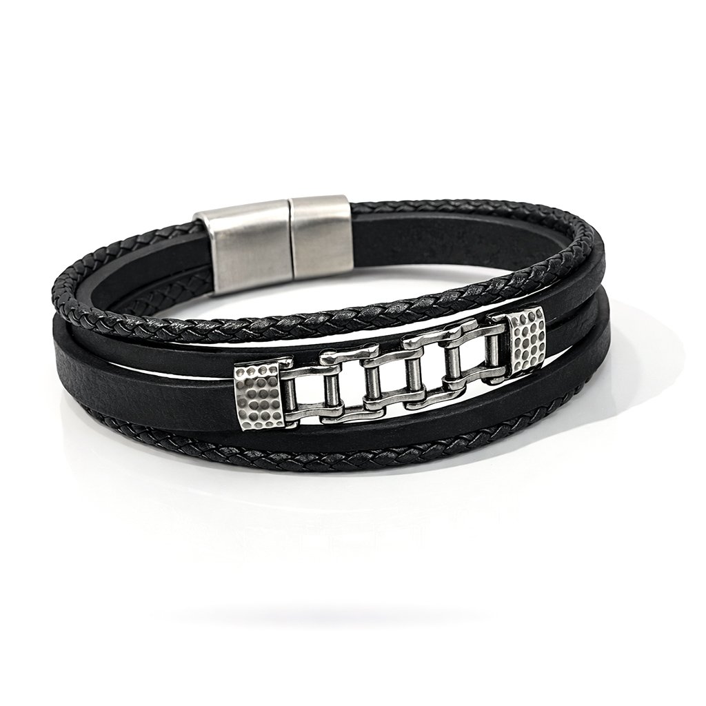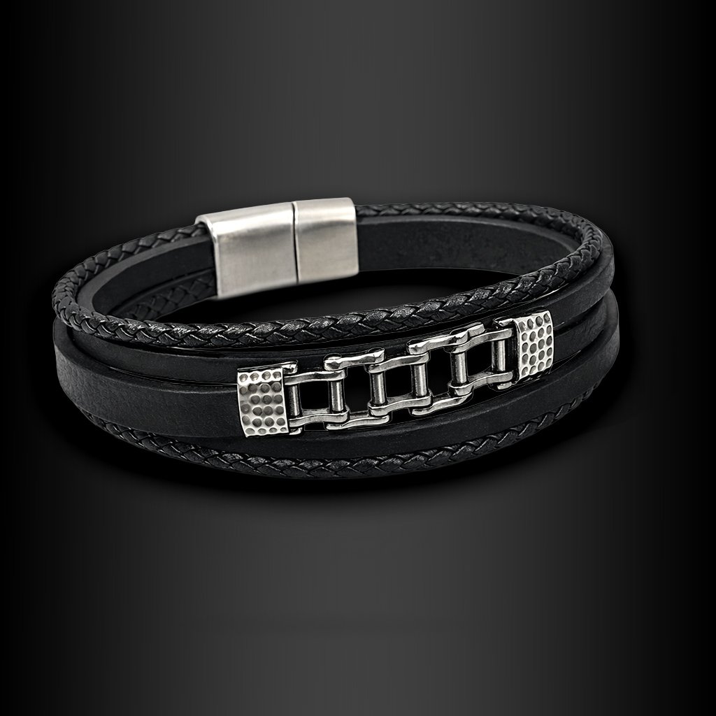 Bravor je pánský náramek, který staví na kombinaci hladké PU kůže, splétaných detailů a masivního ocelového řetězového prvku. Celek působí technicky, pevně a vyváženě – ideální pro muže, kteří preferují funkční design s jasným charakterem.