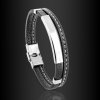Stylový pánský náramek z černé PU kůže a oceli se dvěma koženými prameny. Jeden pramen zdobí ocelová destička a druhý bílé prošívání.