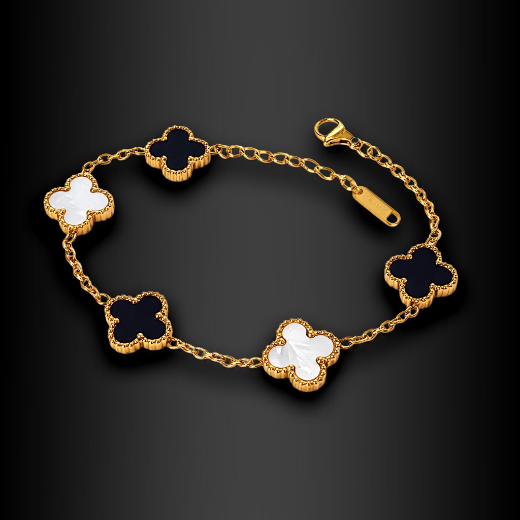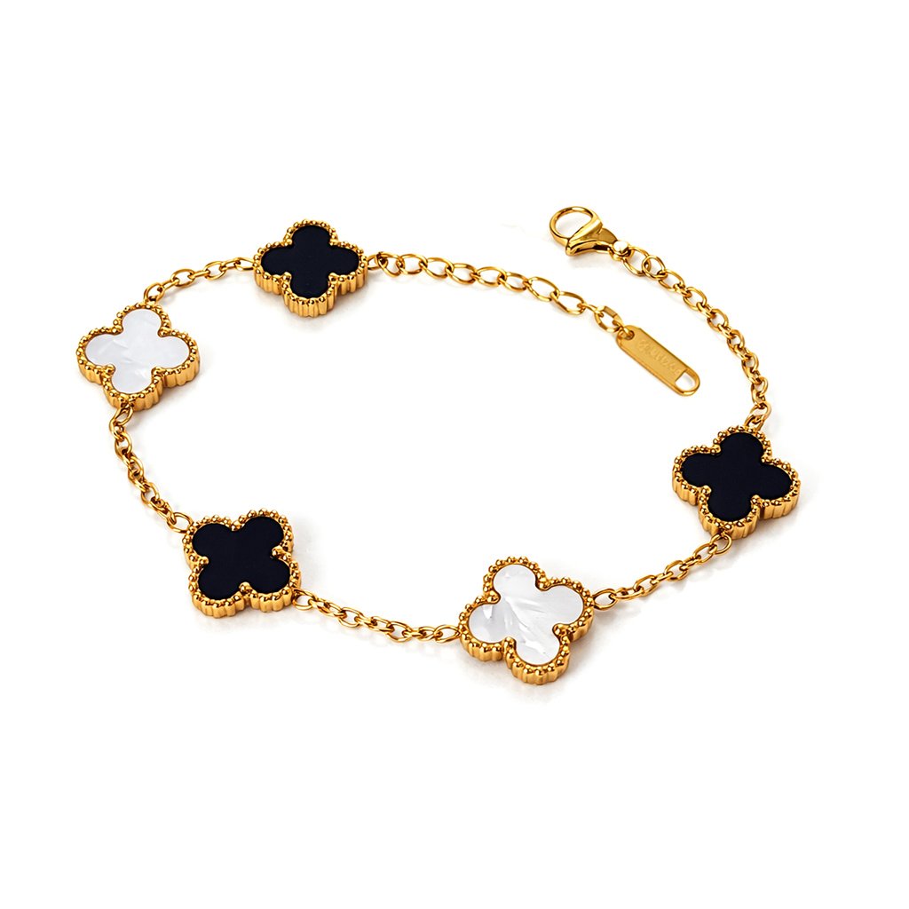 Dámský ocelový náramek Quattro Black Pearl inspirovaný ikonickým čtyřlístkovým stylem. Kombinace černých a perleťových motivů ve zlatém provedení vytváří elegantní kontrast a nadčasový vzhled. Nastavitelná délka zajišťuje dokonalé přizpůsobení zápěstí 🖤 Exkluzivně na DG Šperky