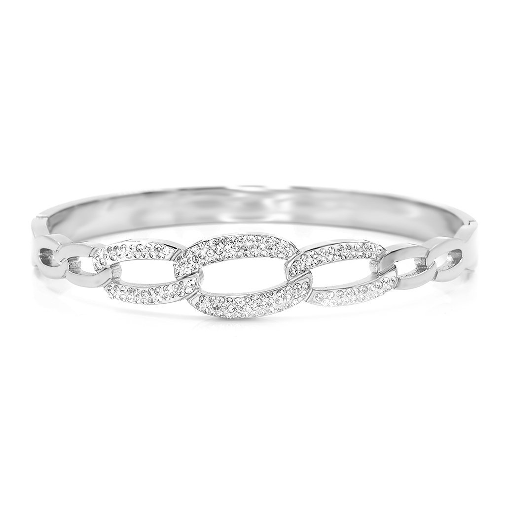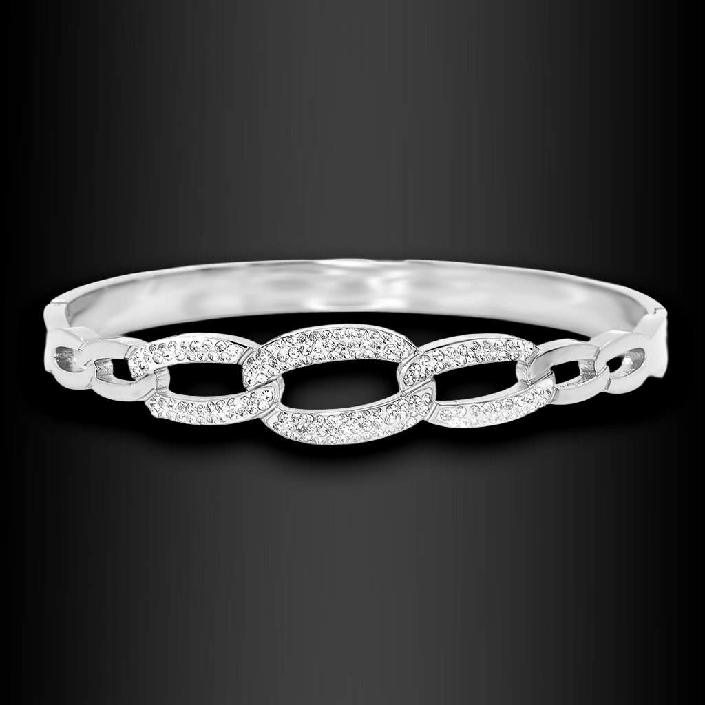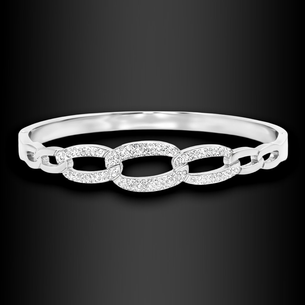 Tento dámský náramek je důkazem, že elegance nemusí být složitá. Pevný oválný tvar působí čistě, vyváženě a velmi žensky. Dominantním prvkem jsou oválné články osazené jemnými zirkony, které náramku dodávají decentní třpyt a pocit luxusu bez přehnané okázalosti.