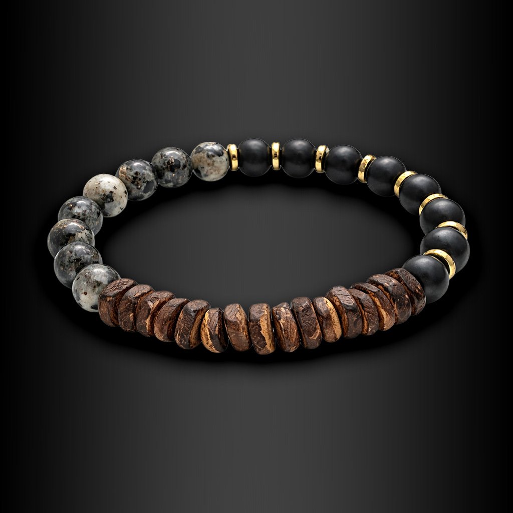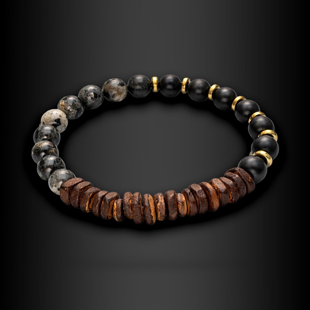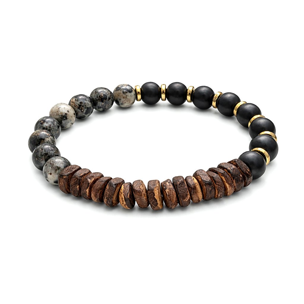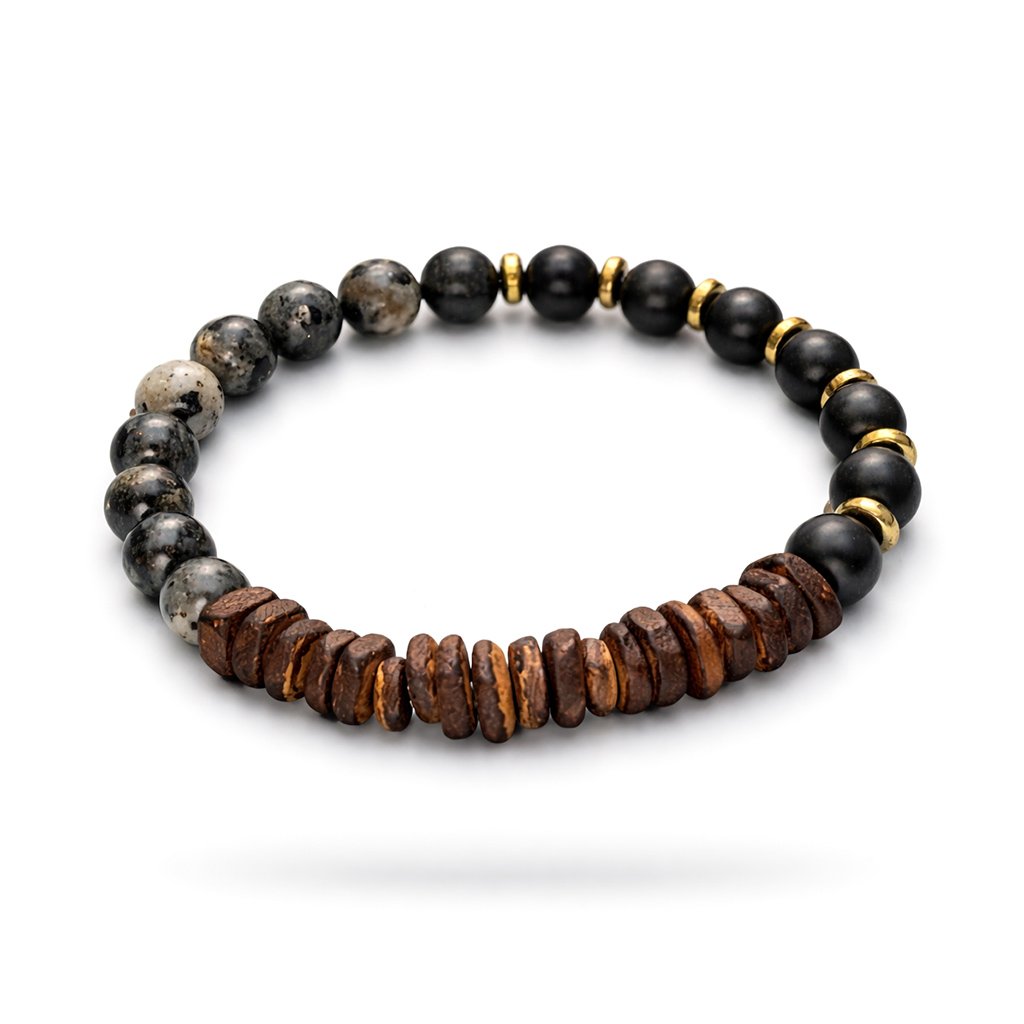 Ventor je pánský náramek, který staví na kombinaci přírodních materiálů a minimalistického designu. Tmavé kameny doplněné o strukturované dřevěné korálky vytvářejí vyvážený kontrast mezi syrovostí a klidem. Celek působí nenápadně, ale přitom má jasný charakter.