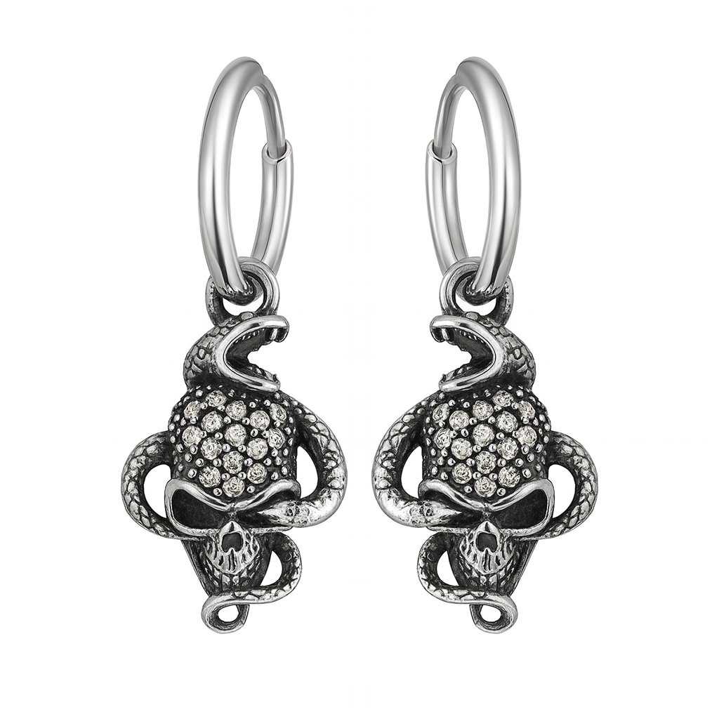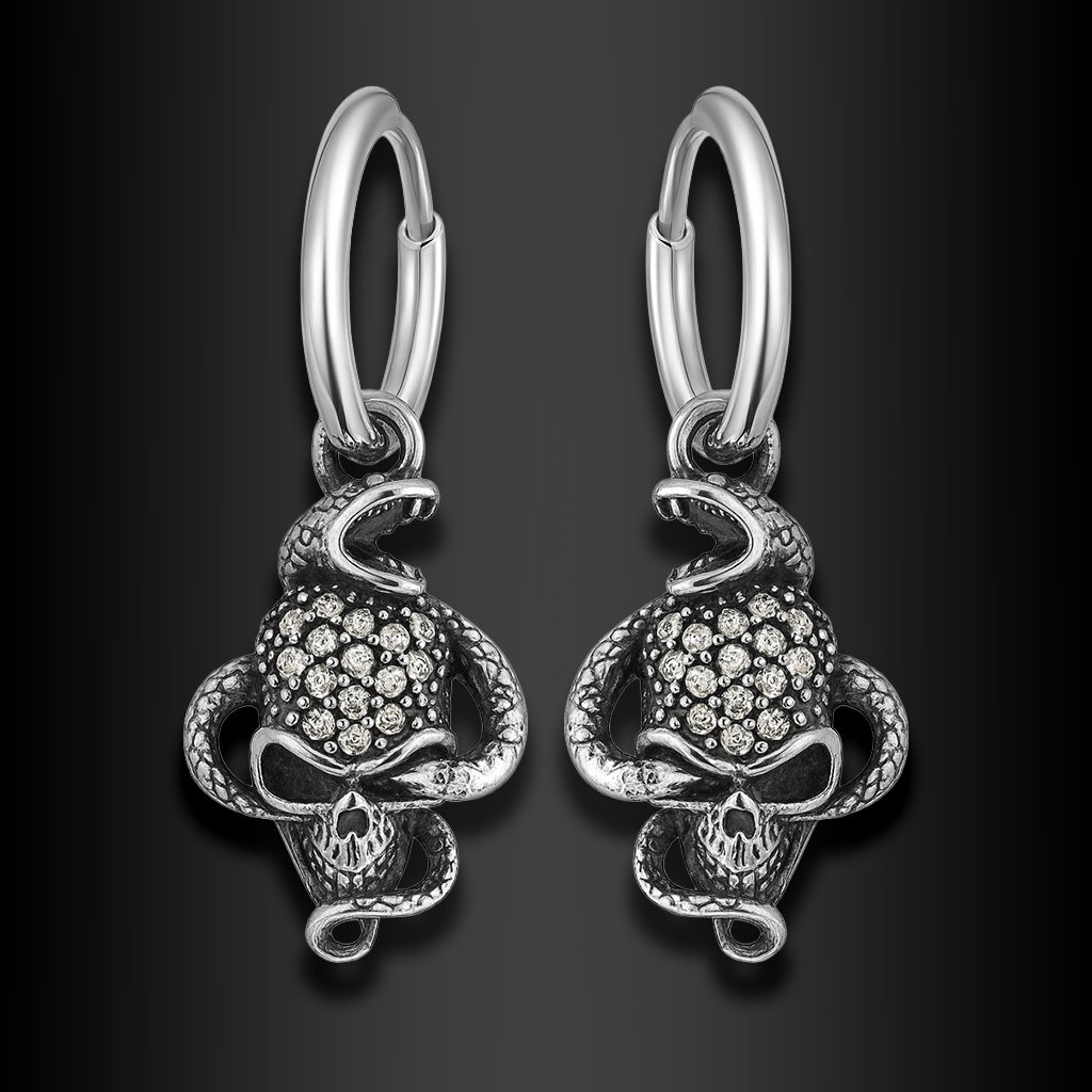 Dámské ocelové náušnice s lebkou, hadem a zirkonovým zdobením. Odvážný šperk s nádechem tajemství 🖤 Exkluzivně na DG Šperky