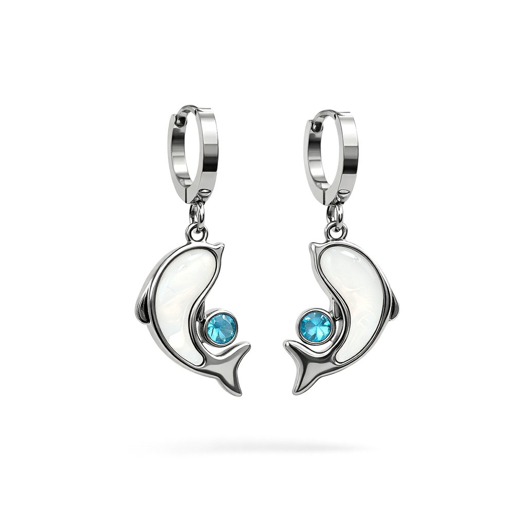 Delphina – dámské ocelové náušnice delfín s modrým kamenem, stříbrné provedení ♀️ DG Šperky