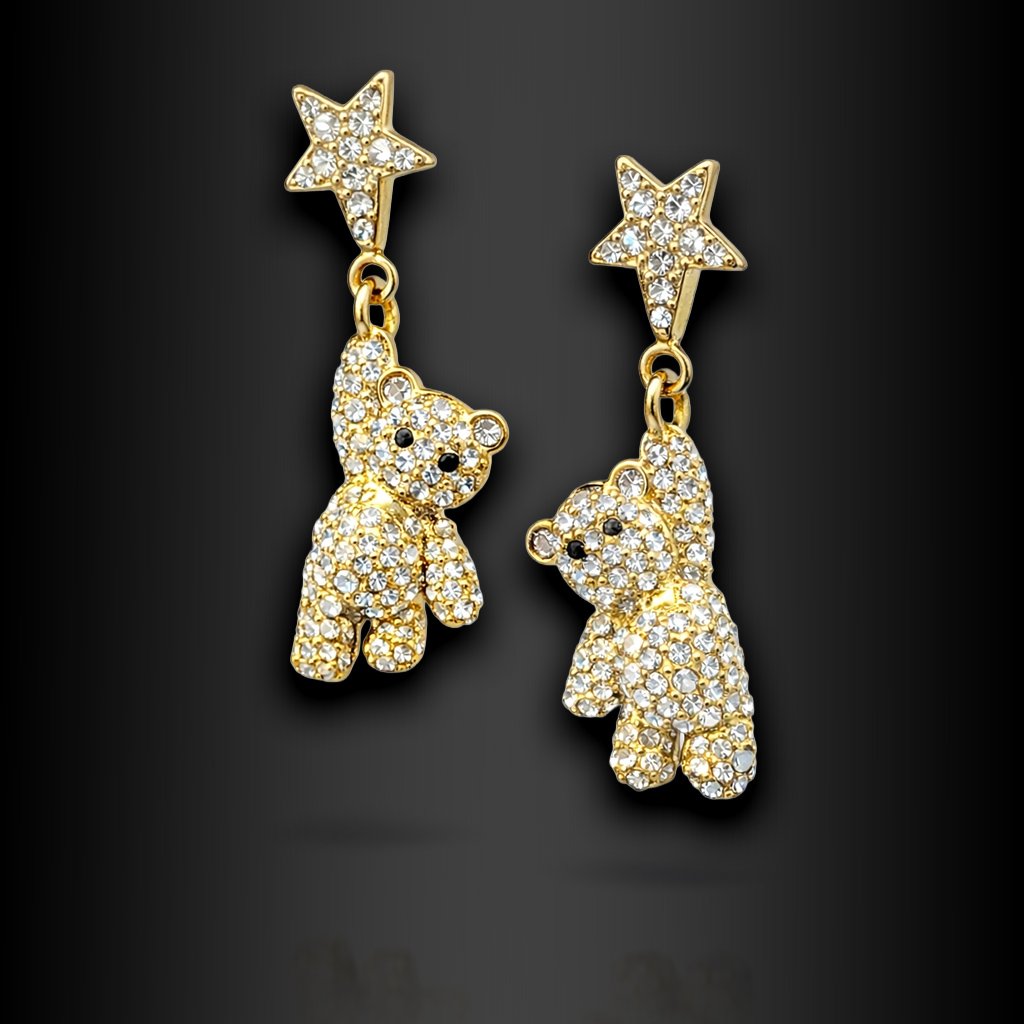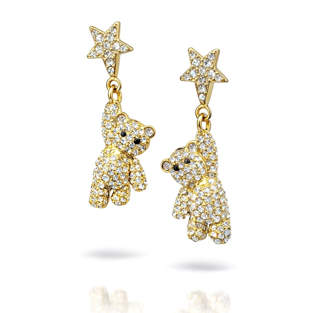 Dominantní hvězda s třpytivými zirkony drží jemně zavěšeného medvídka, který je kompletně osazen drobnými kameny. Každý pohyb hlavy způsobí, že se světlo rozbije do desítek odlesků – a přesně to je moment, kdy si okolí všimne.
