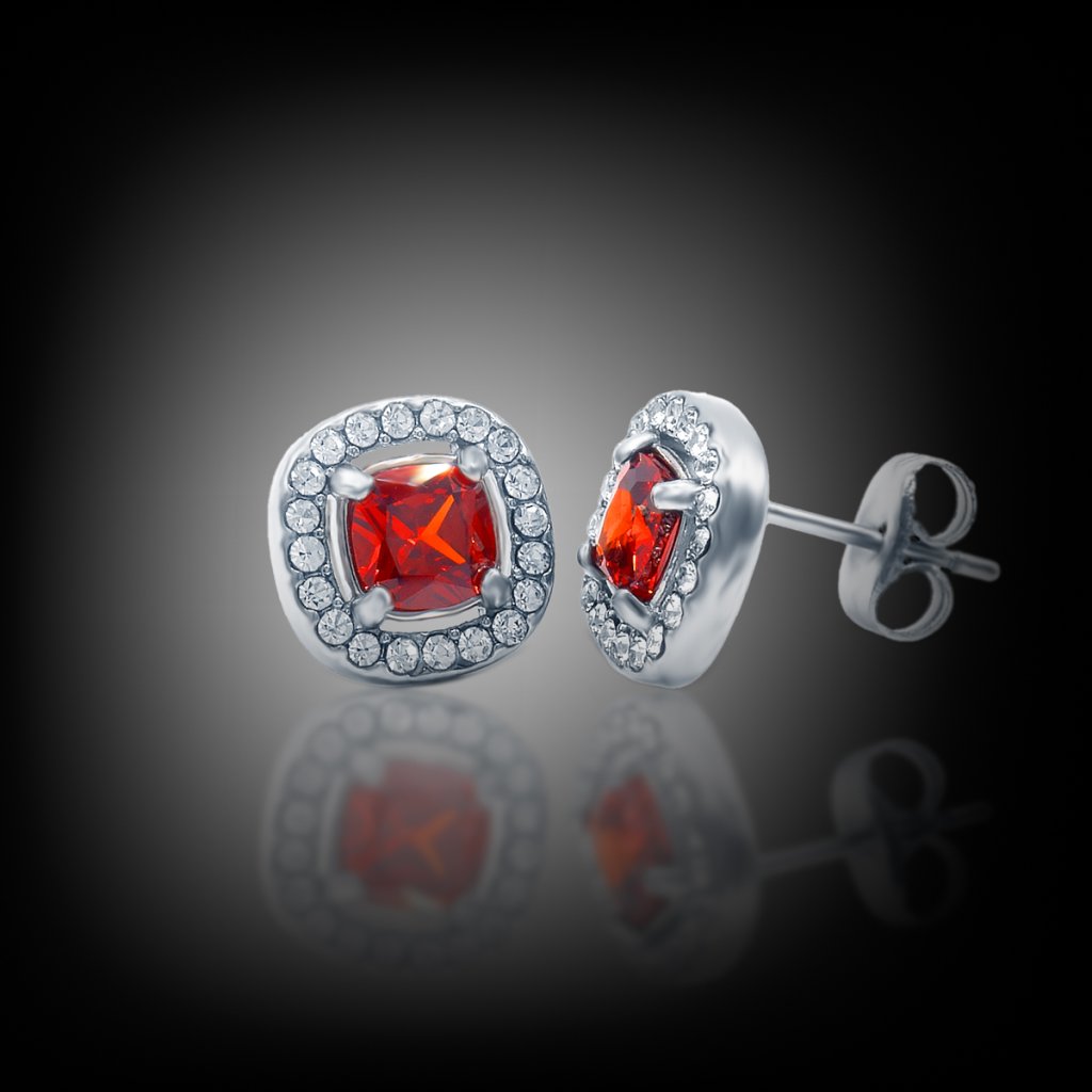 Každá náušnice má nádherný zirkon v barvě rubínu, obklopený malými čirými zirkony, které krásně odrážejí světlo.