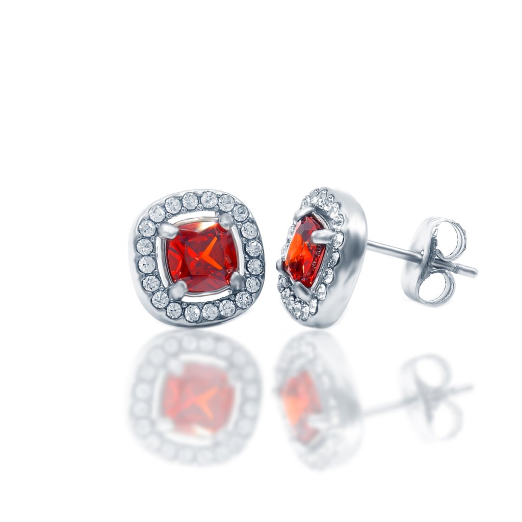 Každá náušnice má nádherný zirkon v barvě rubínu, obklopený malými čirými zirkony, které krásně odrážejí světlo.