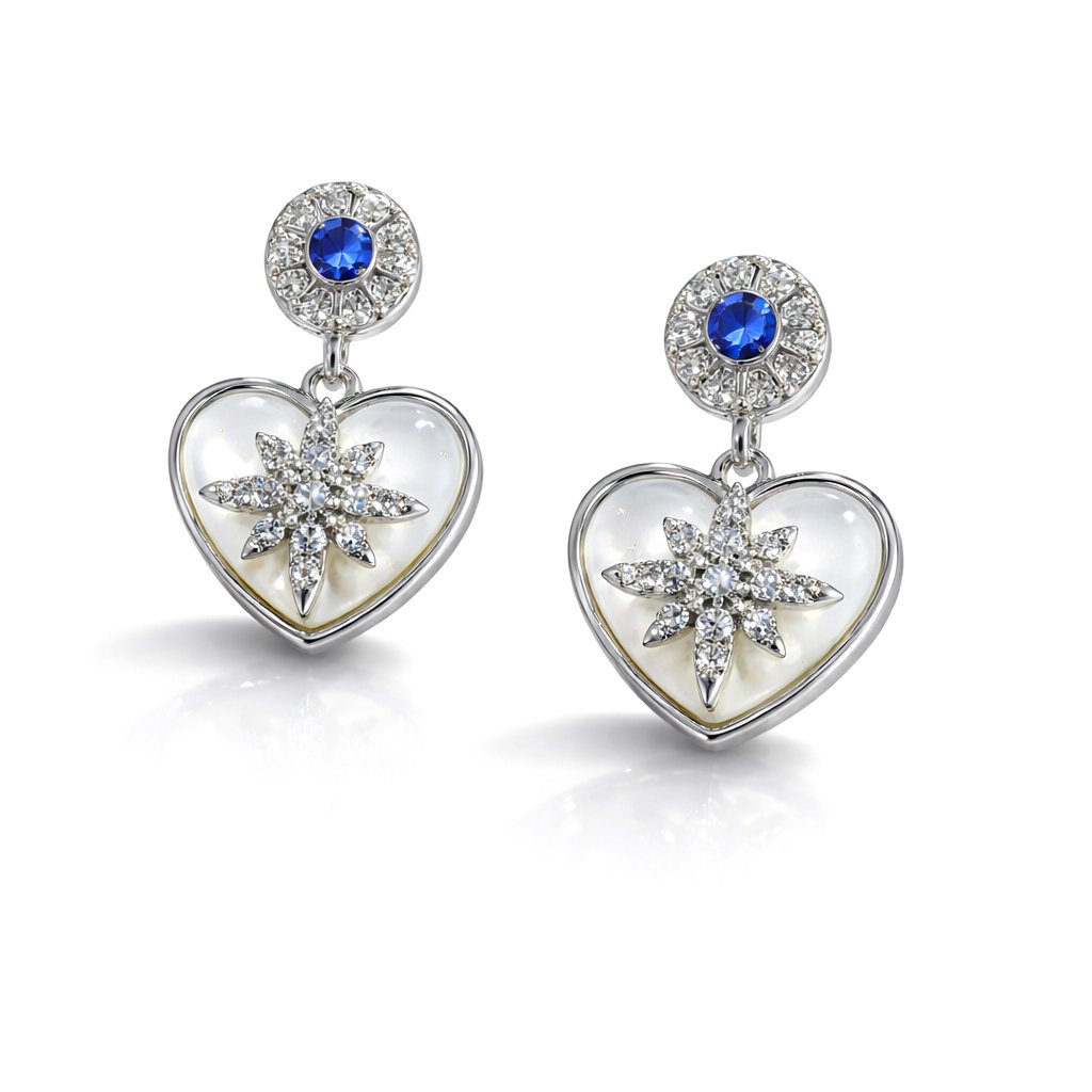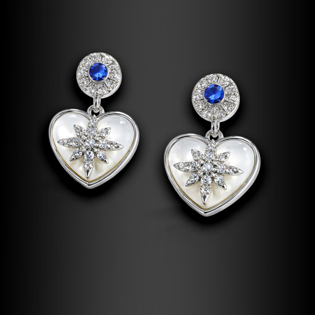 Dominantním prvkem je jemně tvarované srdce vyplněné perletí, která působí čistě a sofistikovaně. Uprostřed se třpytí hvězda tvořená precizně vsazenými zirkony, jež zachycují světlo při každém pohybu. Horní část doplňuje výrazný modrý kamínek obklopený drobnými zirkony, který náušnicím dodává hloubku a noblesu.