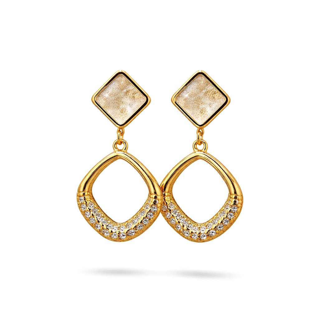 Horní geometrický prvek dodává náušnicím moderní charakter, zatímco spodní otevřený tvar s osazenými zirkony přináší lehkost a pohyb. Chirurgická ocel zajišťuje dlouhou životnost, vysoký lesk a komfort při nošení.