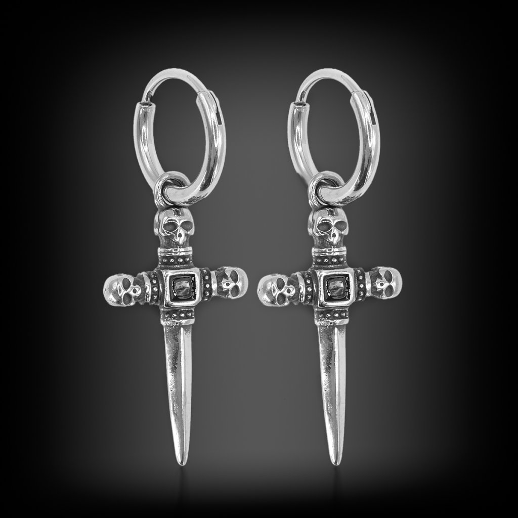 Elegantní ocelové náušnice zdobené unikátním přívěskem ve tvaru křížku, symbolizujícím meč s lebkami.