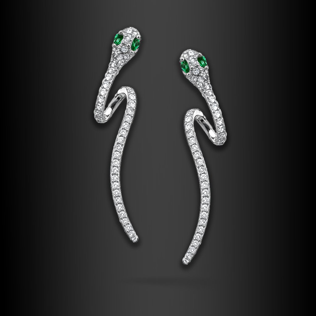 Celé tělo náušnic je zdobeno třpytivými kameny, které zachycují světlo při každém pohybu. Výrazné zelené oči dodávají hadovi charakter a dramatický akcent, který okamžitě přitáhne pozornost.