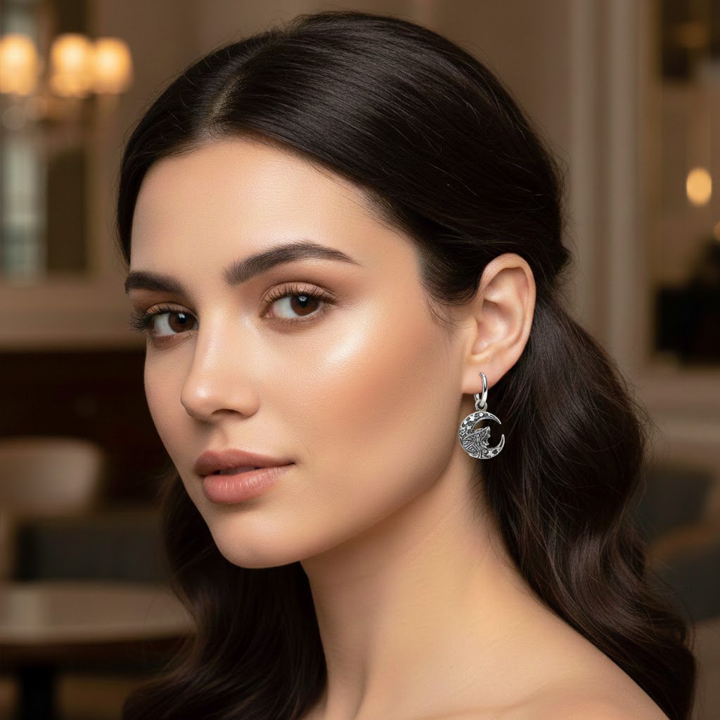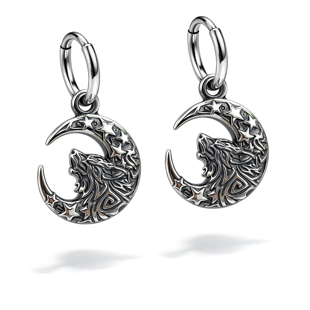 Motiv vlka je zasazen do půlměsíce se zdobenými hvězdami, což vytváří harmonickou, ale zároveň dramatickou kompozici. Díky plastickému 3D zpracování vyniknou jednotlivé detaily při každém pohybu a náušnice působí živě a dynamicky.
