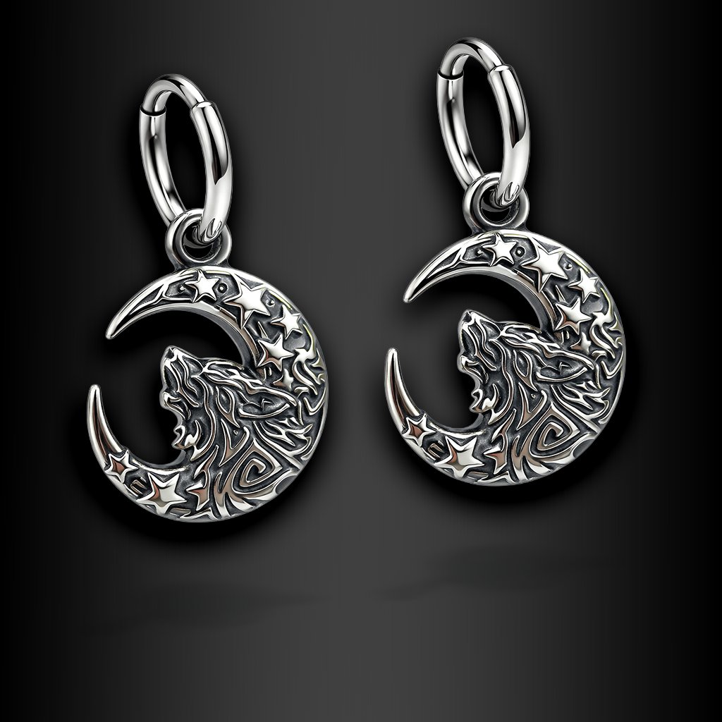 Noctyra – dámské ocelové náušnice s motivem vlka a měsíce ♀️ DG Šperky