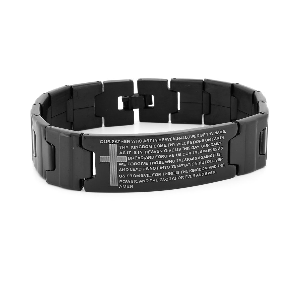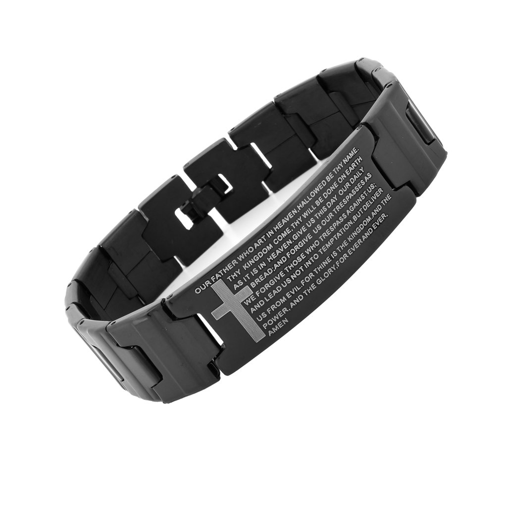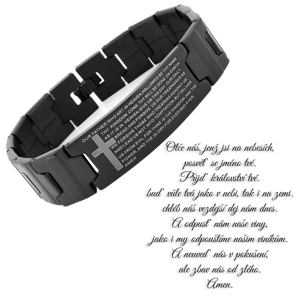 Elegantní černý ocelový náramek s destičkou na které je modlitba „Otče náš“.