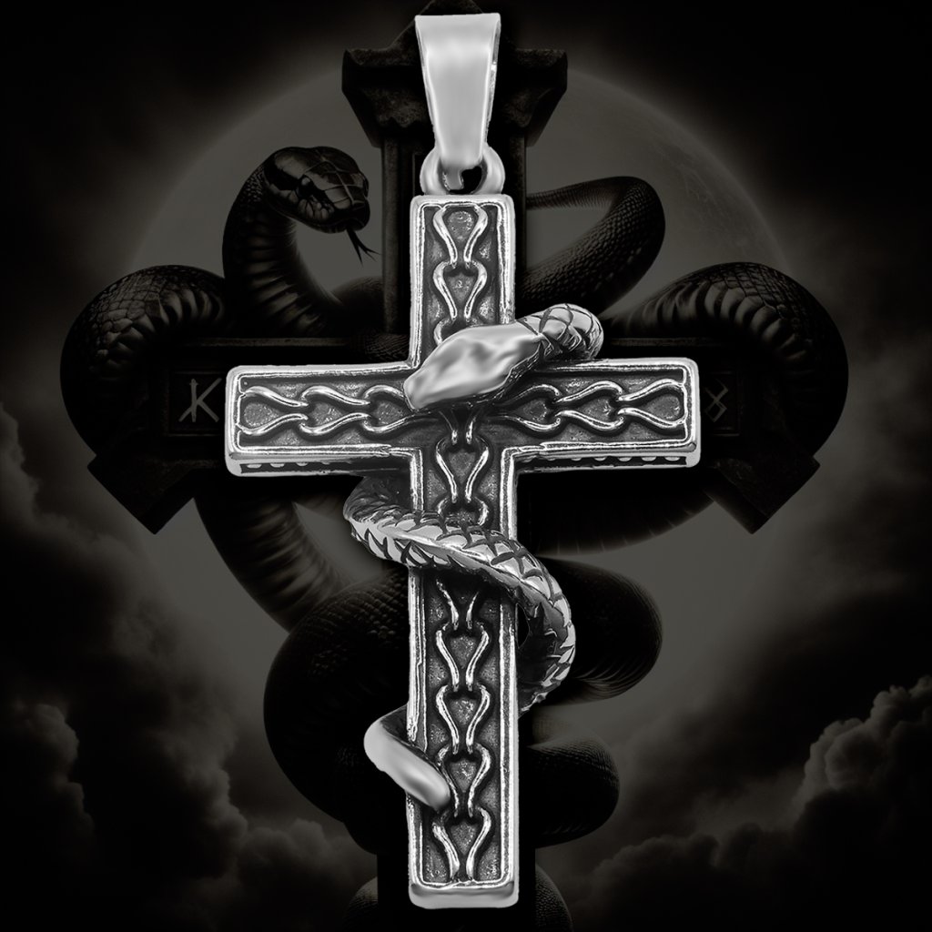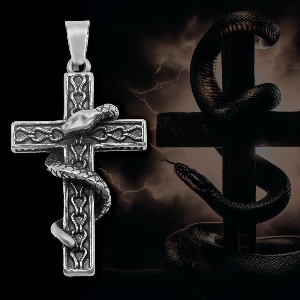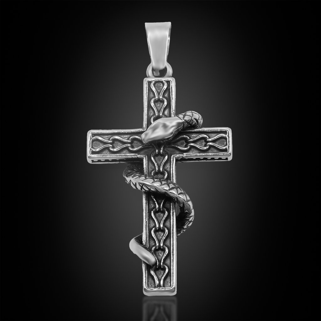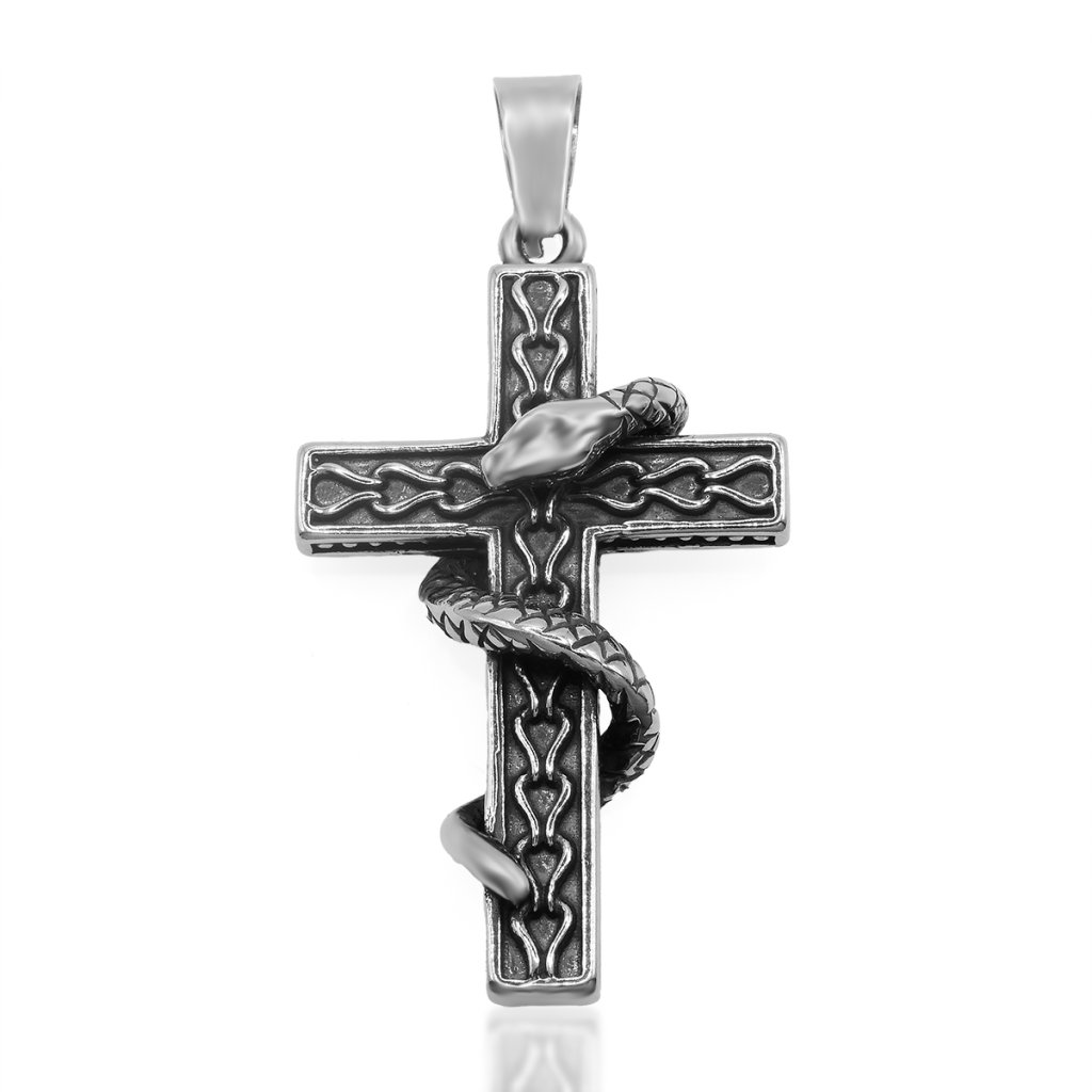 Pánský ocelový přívěsek představující křížek, kolem kterého se ovíjí had jako symbol hříchu.