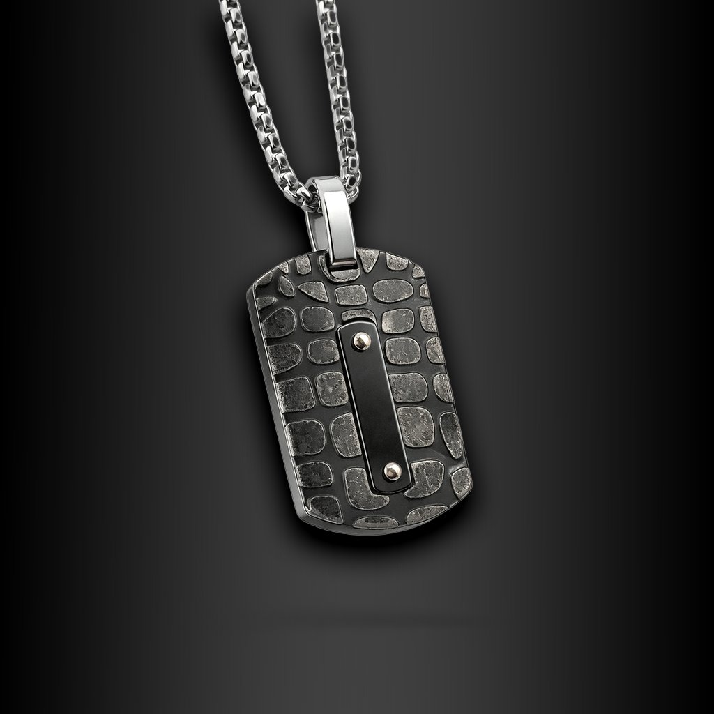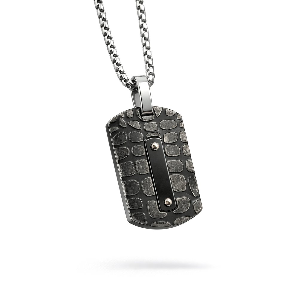 Pánský přívěsek Aldren z chirurgické oceli v podobě strukturované destičky s černým detailem. Nadčasový a maskulinní styl ♂️ DG Šperky
