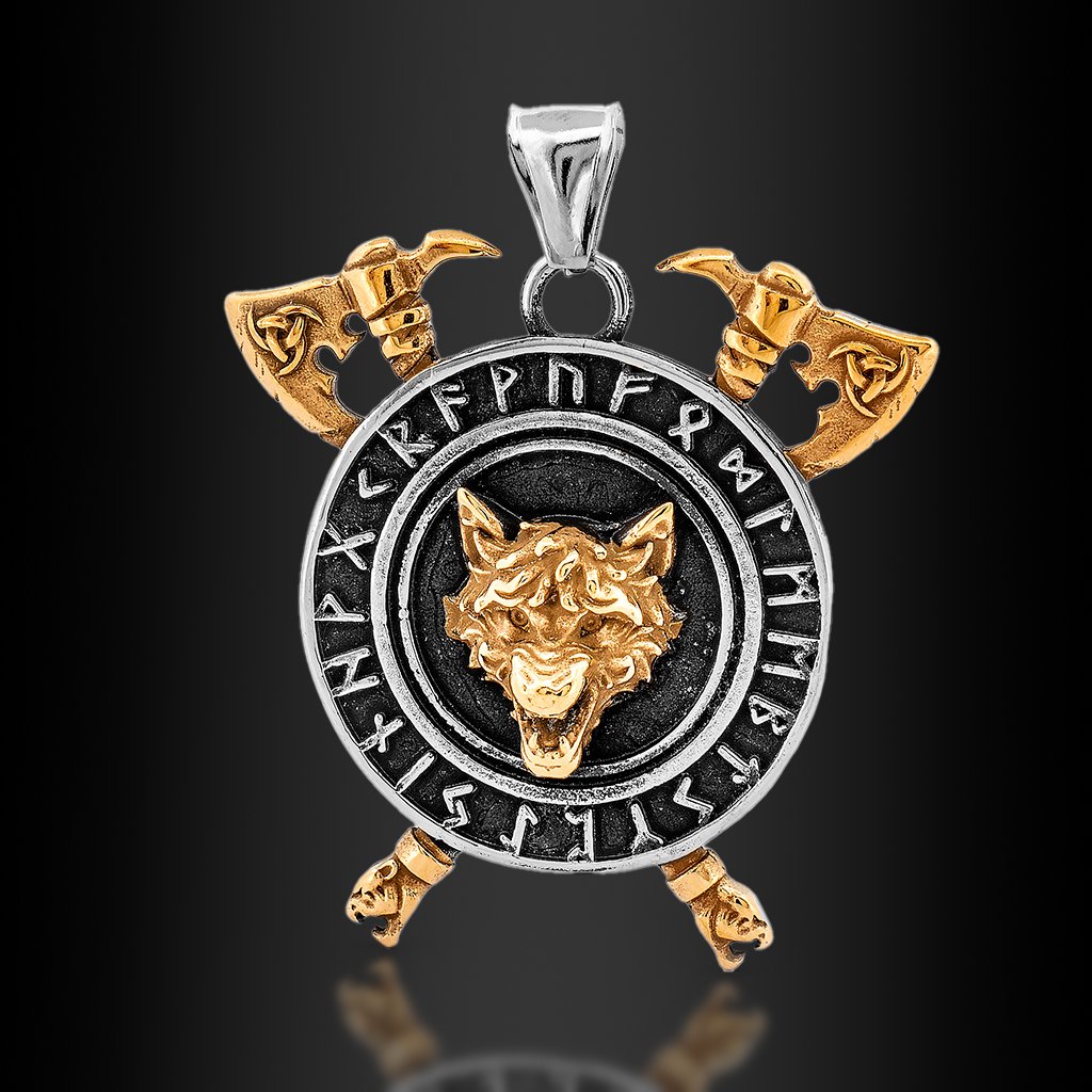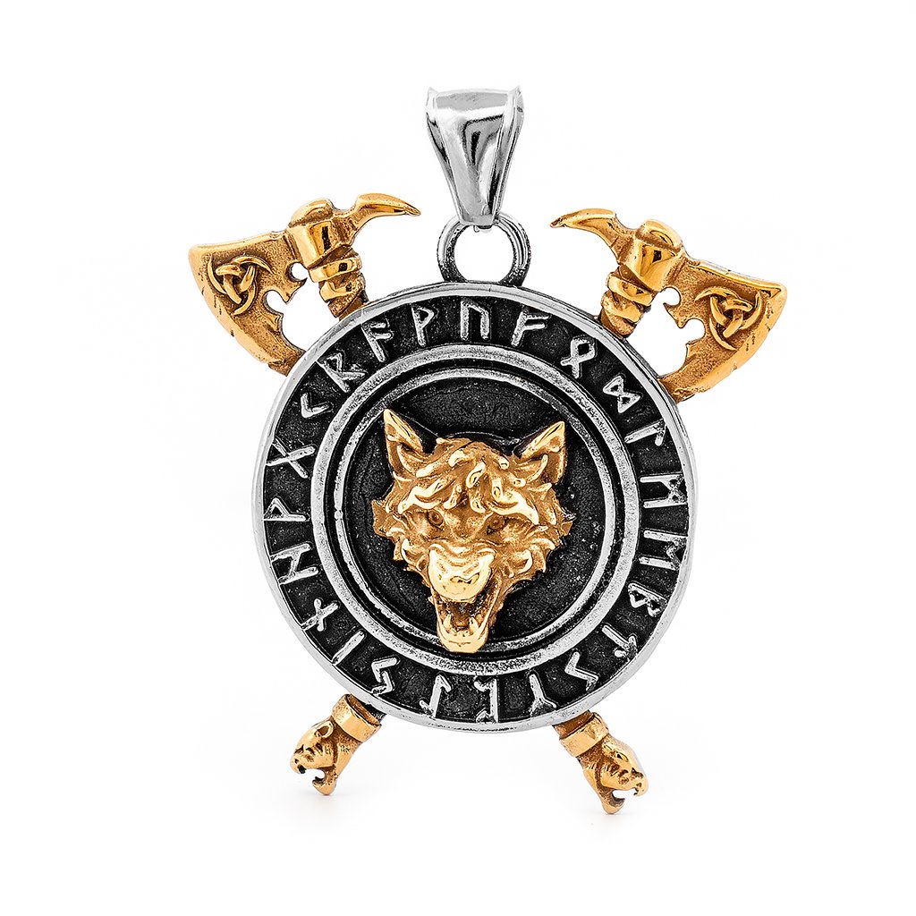 Ocelový přívěsek s runami a vlčí hlavou ve zlatém provedení, se zkříženými válečnými sekerami, oboustranný design. Řetízek zdarma.