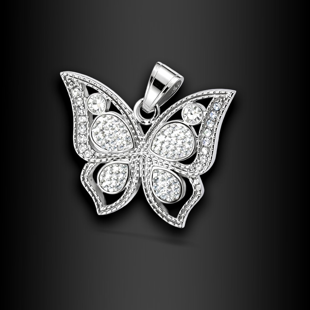 Tělo i křídla motýla jsou osazeny jemnými zirkony, které zachytávají světlo a dodávají přívěsku decentní třpyt. Šperk působí ženským a čistým dojmem, bez zbytečné okázalosti.