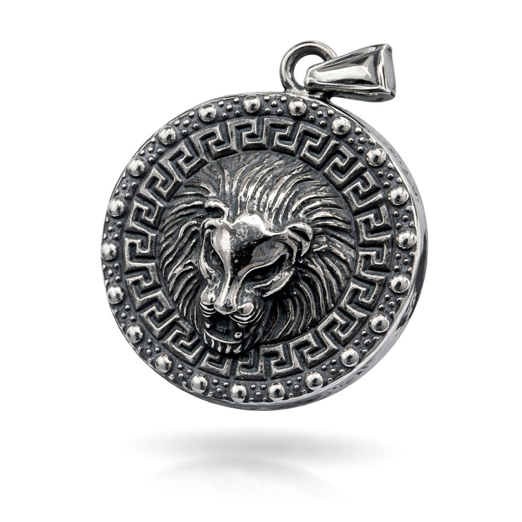 Masivní pánský ocelový přívěsek s hlavou lva a řeckým ornamentem. Symbol síly, autority a dominance 🖤 Exkluzivně na DG Šperky