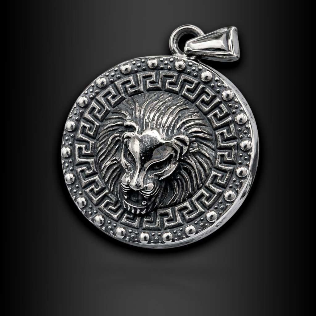 Kruhový tvar přívěsku je lemován výrazným řeckým ornamentem, jenž odkazuje na antický řád, disciplínu a nadčasové hodnoty. Celek působí masivně, ale vyváženě – žádná laciná okázalost, jen čistá síla v kovu.
